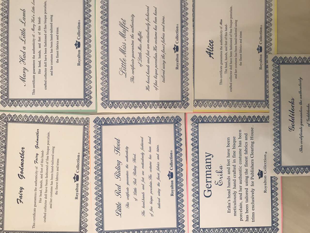 STORYBOOK Doll Royalton Collection Certificate Fairy Godmother Alice Goldilocks Erika Little Miss Muffet Red Riding Hood Mary LambEach certificate is taped to cardstock except Goldilocks