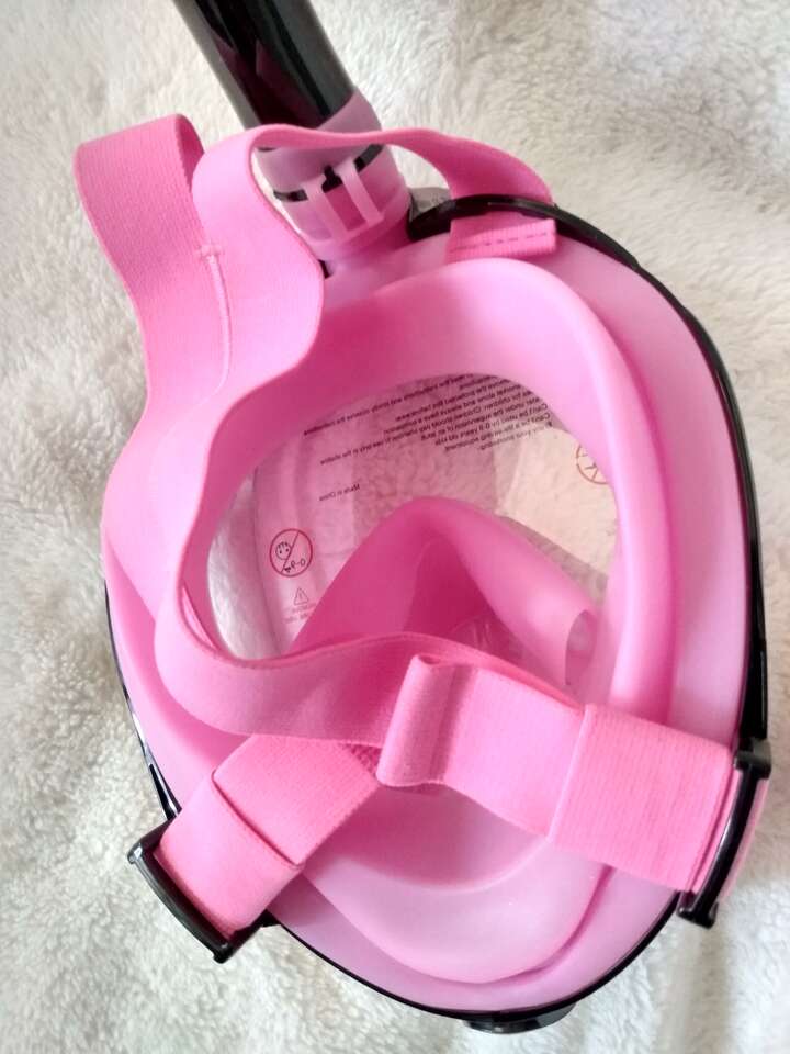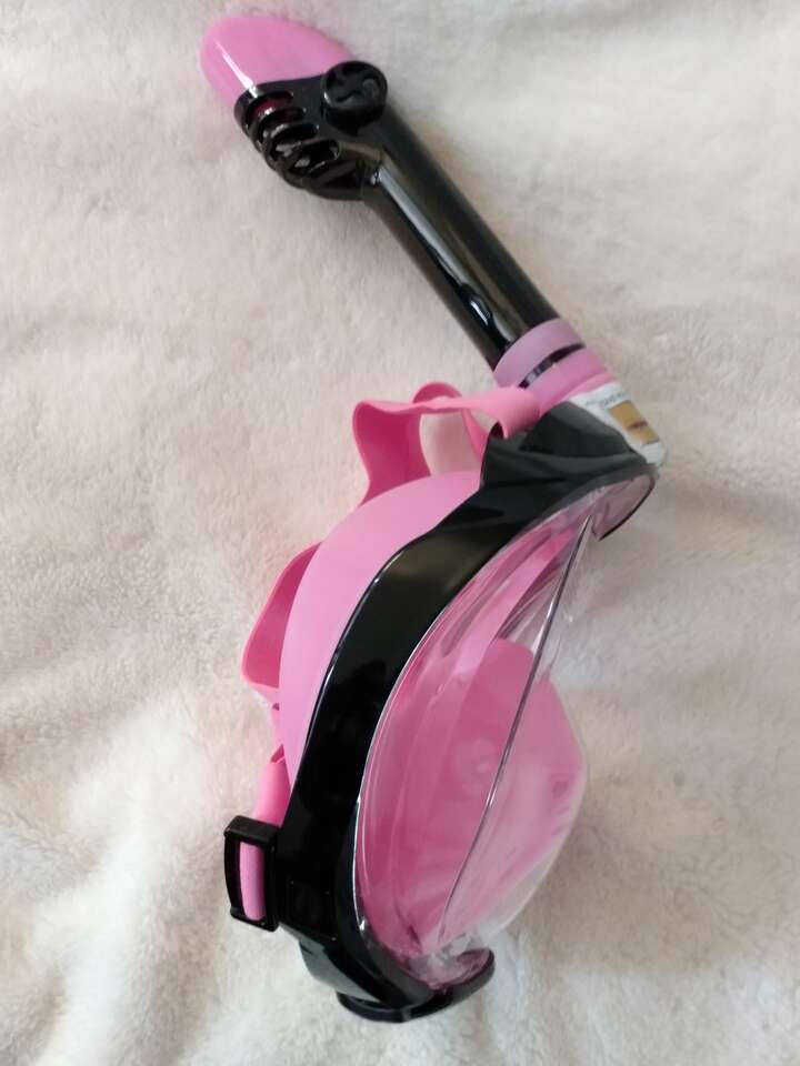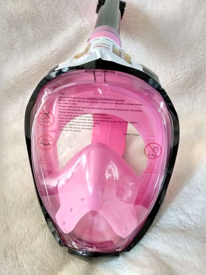 This snorkeling mask has a full face mask. The snorkel is attached to the top of the mask. At the top of the snorkel it has a small cage with a ball in it, so when you are snorkeling and go a little too deep, the little ball rises and keeps you from inhaling water. Cash only. No codes. I live in Roy, Utah.