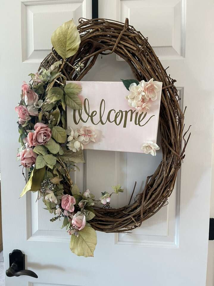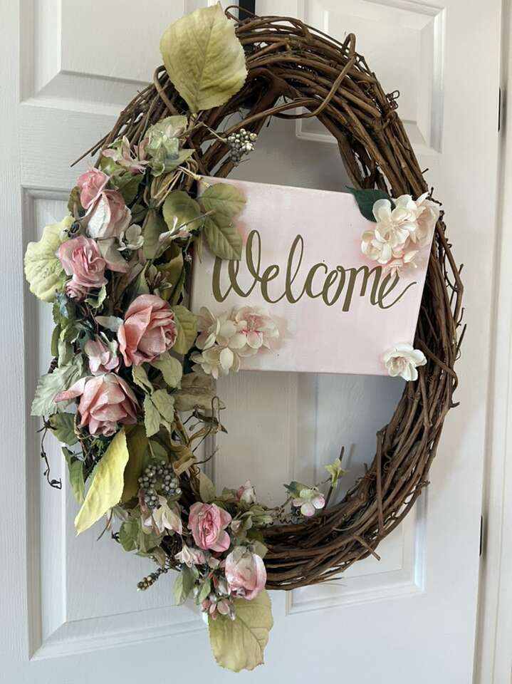 XL fancy welcome wreath pink roses 29 inches tall 22 inches wide