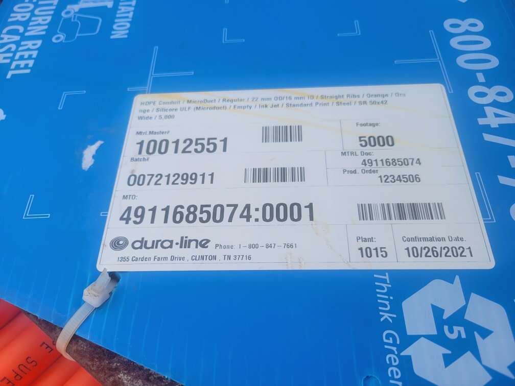 I also have 1 spool of 1.25" conduit (can be used as pipe) in a 7,000' spool. This is the orange and blue spool (3,500' of each color, blue & orange). Sold by the spool for $5,000. That's about $0.71 per foot.