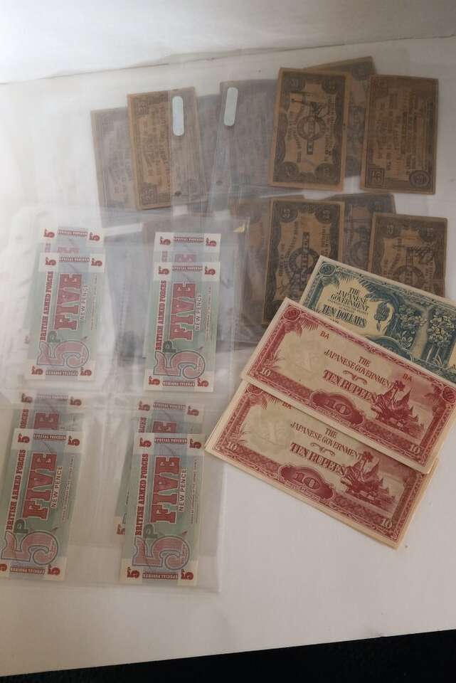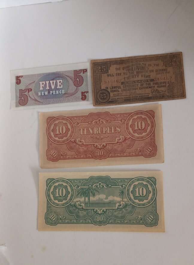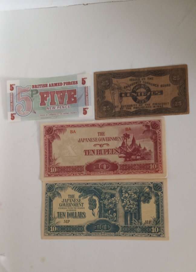 Original WW11 emergency currency 1942- 25 centavos Philipines,, these are Circulated. $5.00 ea. British Armed Forces 5 New Pence special Voucher unc. 6.50 ea. Unc. Crisp Japanese Government 10 Rupees and Japanese/Burma Government 10 Dollars (MP). Selling for price listed . All notes are from 1942-1945.