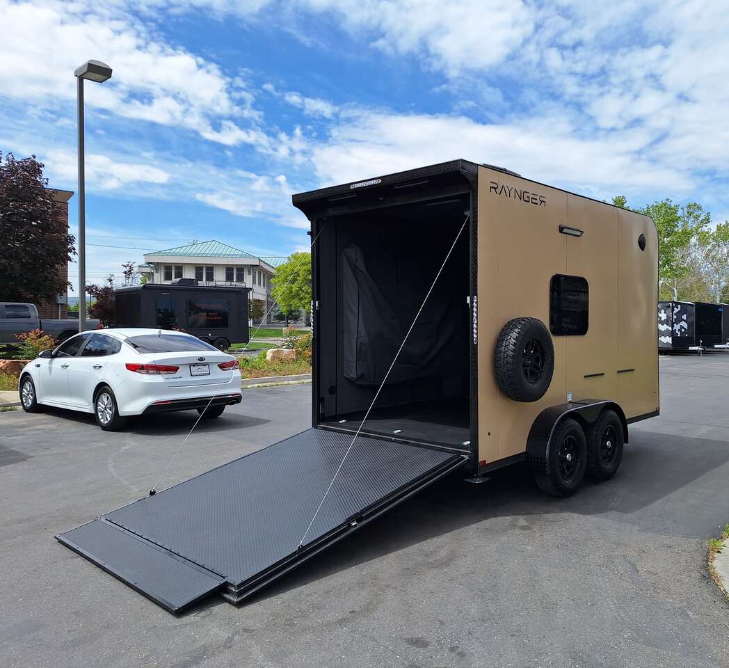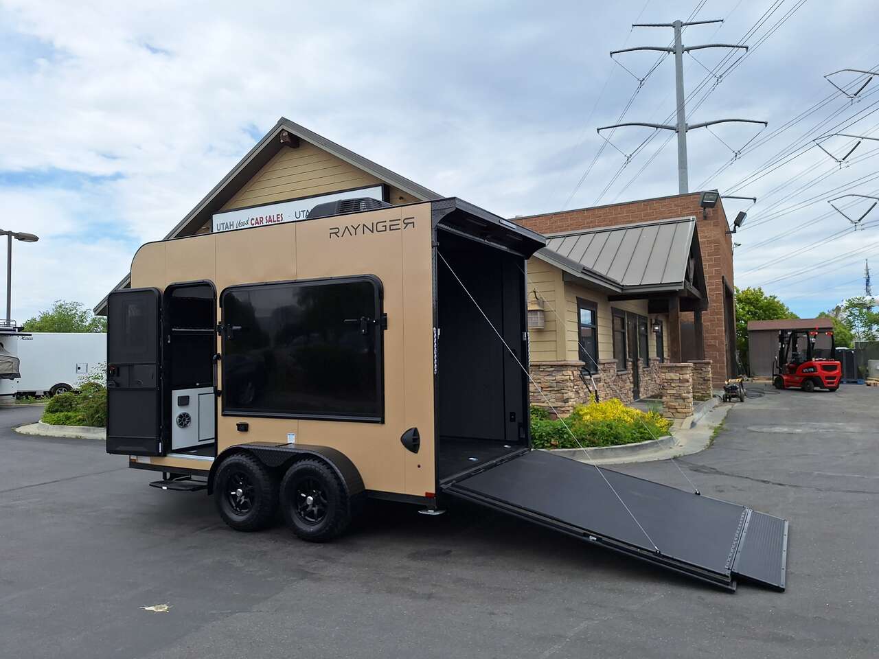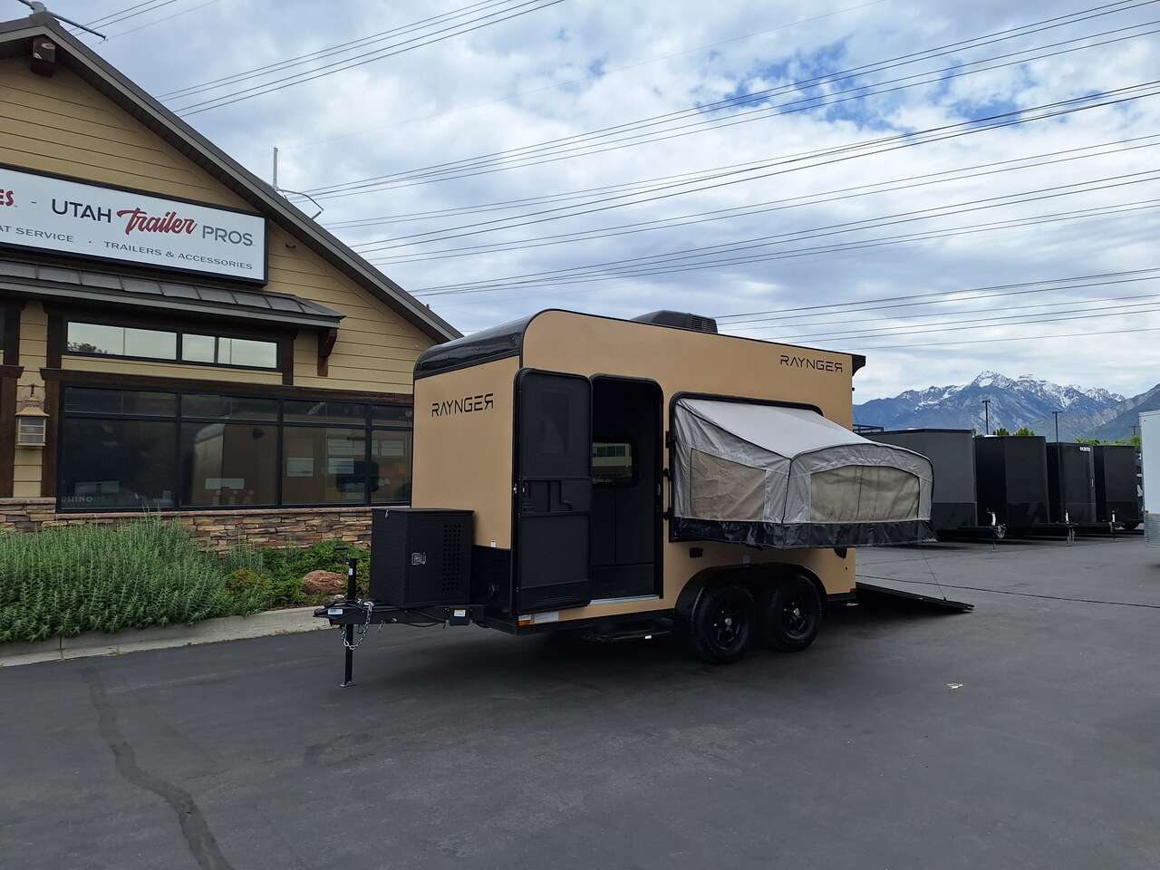 LIMITED TIME $154 A MONTH WITH ZERO DOWN WITH OUR SPECIAL LOCAL CREDIT UNION PARTNER!!! NO PRE-PAYMENT PENALTIES!!! NEW 2025 MODEL!!! RAYNGER PREMIUM OFF ROAD TOY HAULER CAMPER!!! 19 INCH GROUND CLEARANCE!!! OFF ROAD TIRES!!! FULLY INSULATED!!! HEATING AND A/C!!! WET SOUND STEREO!!! FOLD OUT/POP OUT TENT WITH MATTRESS!!! 84 Inch Rear Entry Height/87 INCH INTERIOR HEIGHT!!! 77 Inch Rear Entry Width!!! Aluminum Ventilated Locking Generator Box!!! UPGRADED TORSION AXLES!!! 11.1 Foot Long Garage Space!!! And Much MUCH MORE!!! Check out our Specs!!! Also available in 18 foot models. 18 Foot Models can have 3 Fold Out Beds/Pop Out Tents. 16 Foot and 18 Foot Models will fit ANY stock 4 Seater Side by Side • 6” I Beam Frame• Flat Top Design• Flat Front Design• Wall Posts 16” on Center• Cross Members 16” on Center• Roof Bows 16” on Center• Rust Inhibiting Z-Tech Protection on Chassis• Ameraguard on Tongue• Ameraguard on Rear Bumper• Ameraguard Around All Door Openings and Stepwell• Ameraguard Around Edges of Ramp Door• 3500 LB Spring Axles• 2-5/16” Coupler• One-Piece Aluminum Roof• ST235/75R15 Aluminum Wheels with Chrome Center Caps• 2000# Ramp Door with Eberhard Latch• 30” Tempered Glass RV Door with Screen Door• .030 Exterior Metal with Screwless Sides• 24” Black Stoneguard• 3” Black Bottom Trim• Sand Pad• Black Door Hold• 2.7mm Charcoal Textured Vinyl Ceiling • 9mm Charcoal Textured Vinyl Walls• 3/4” Engineered Wood Floor with Rubber Coin Overlay• (6) 1200 LB Floor D rings Installed with Backer Plates• LED Clearance Lights and Tail Lights• LED Back-up Lights• No Show Wheel Box• Spoiler with Toggle Switch• RV Step• 7’ Interior• (2) 17” Chrome Base Lights with Switch• (1) Black 17” Spot Light with Switch• (1) 30 Amp Panel with Marine Plug• A/C Unit with Heat Strip• (3) Interior Recepts• (1) Exterior Recept• 12V Battery and Charge Line• Prep for Backup Camera• Wet Sounds System• (3) Blue Interior Cabinet Lights• (1) 6’ Section of Flex Lights• Black ATP Rear Header and Hoop• Black ATP Fenders• Insulated Walls & Ceiling• Base Cabinets• Overhead Cabinets with Netting Over Compartments• Pop Out Tent• Black ATP Storage/Generator Box Mounted On Tongue