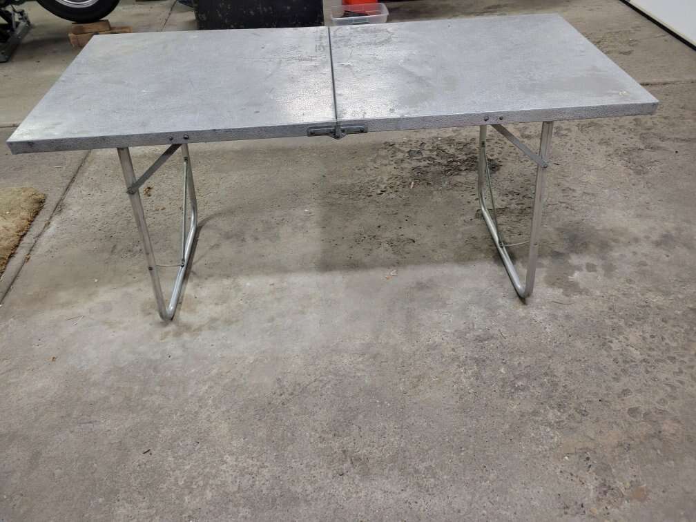 Aluminum folding camp table. Measures 27" wide 60" long and 28" high. Folded measures 27" by 30"