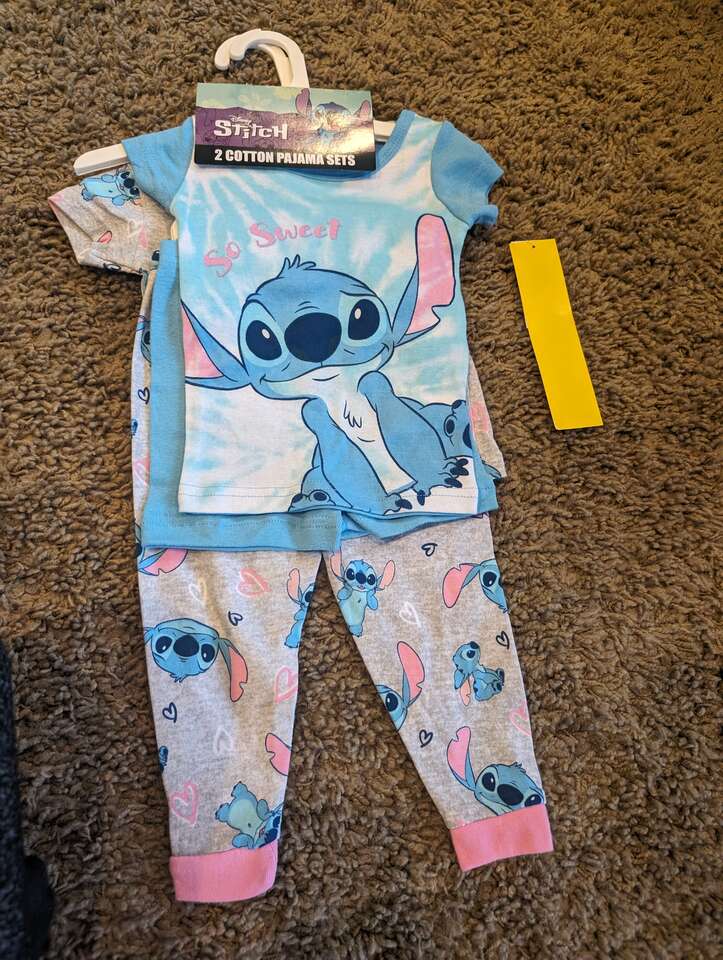 VenmoBrand new 4 piece (2 pair of pajamas) Stitch and Hello Kitty sets. These fit smaller than expected. I would recommend them for a 12 month-old. They are too small for my 18 month-old.