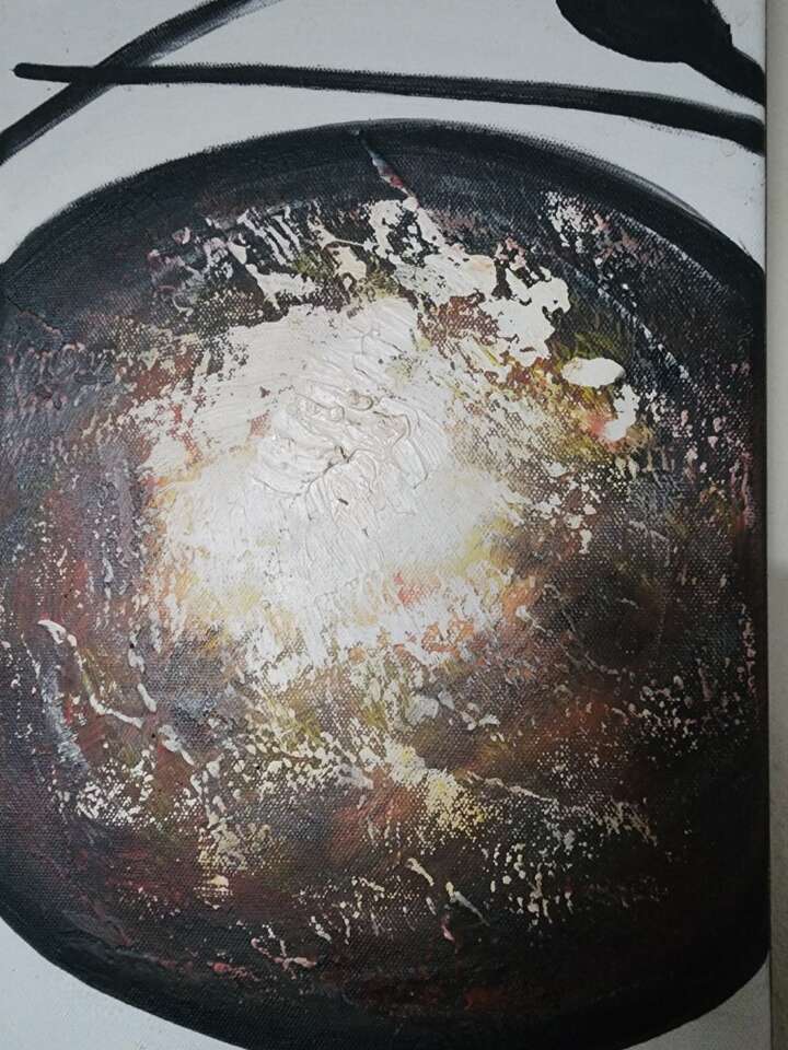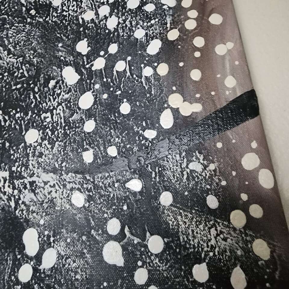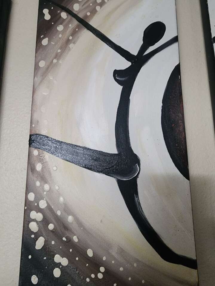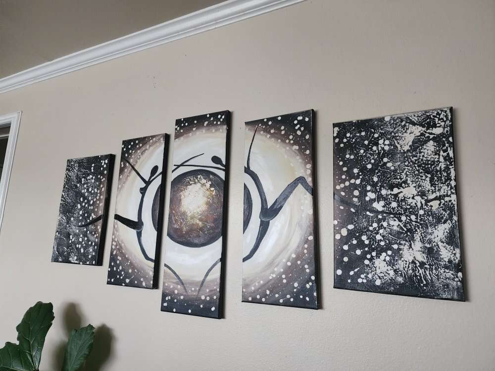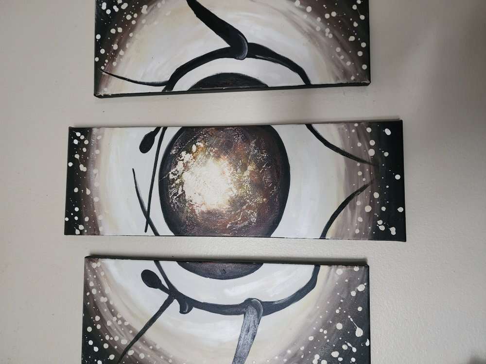Unique and happy painting to make your day better. 24 inches at longest piece. 43 if hung all pieces together. Goes with many styles of decor. Neutral colors with black brown and white. I had this painting for 10 years and it went great with brown or black decor. Oil on canvas. Text preferred Cash or venmo