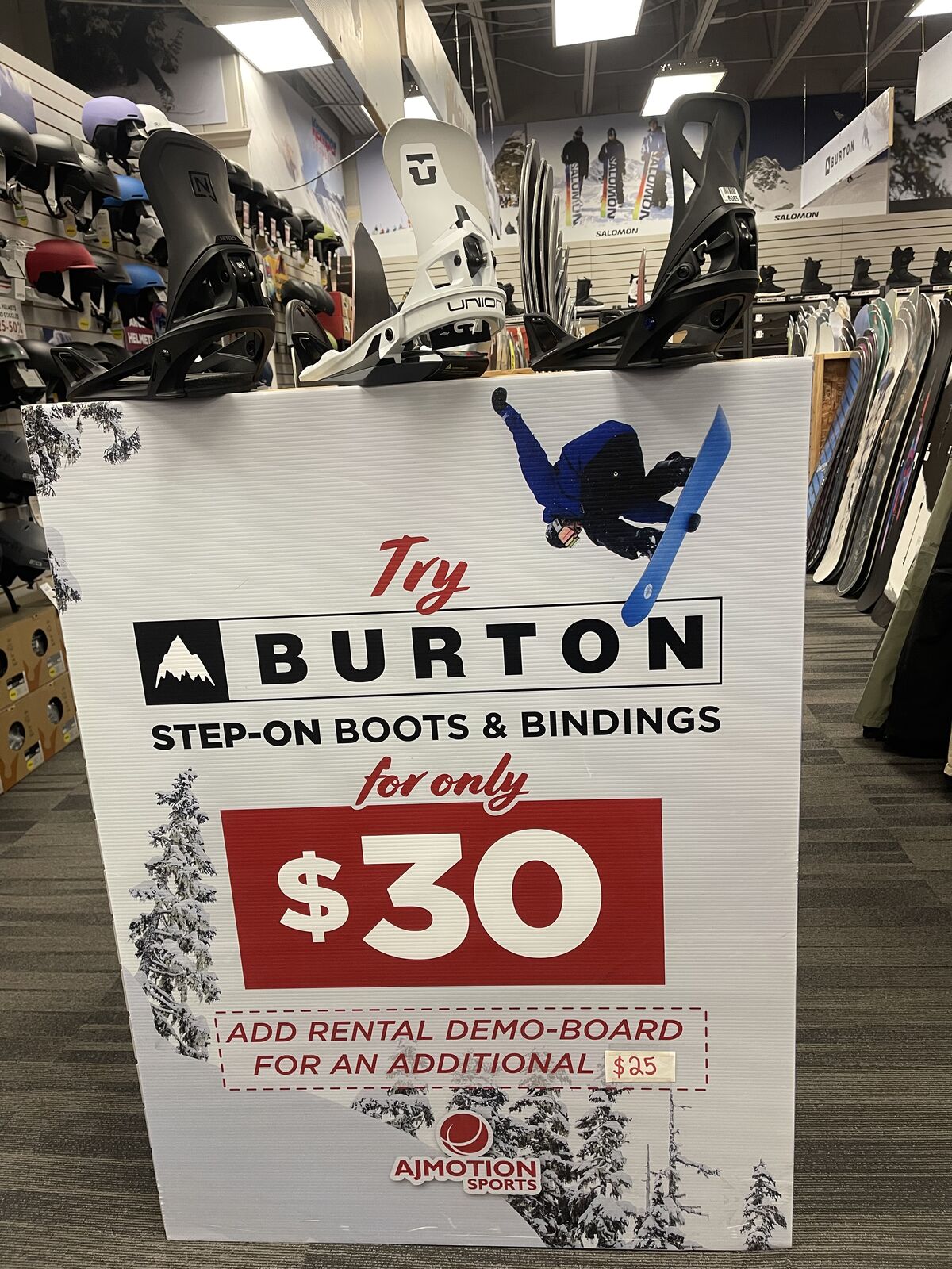 Only $30 to Demo a Burton Step On Boot & Binding on YOUR own board! OR.... Extra charge to use one of our boards. If you want to purchase a set you can apply one day rental fee of $30 toward the purchase in addition to any in-store deals running.
