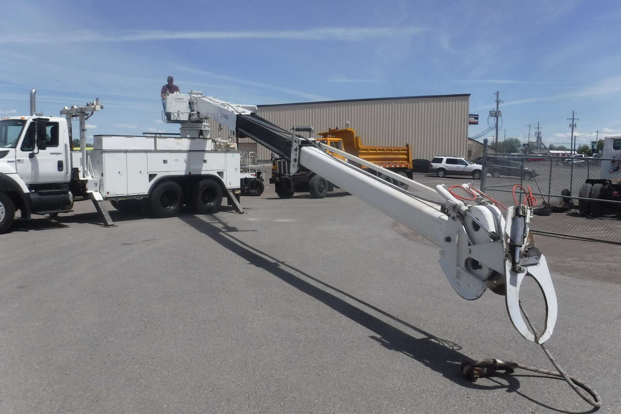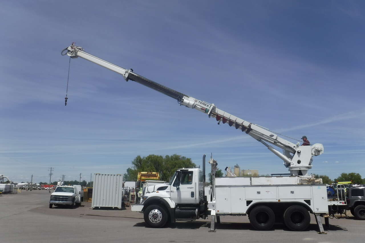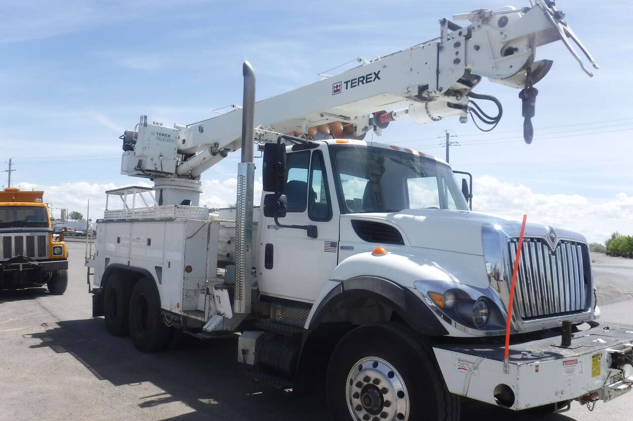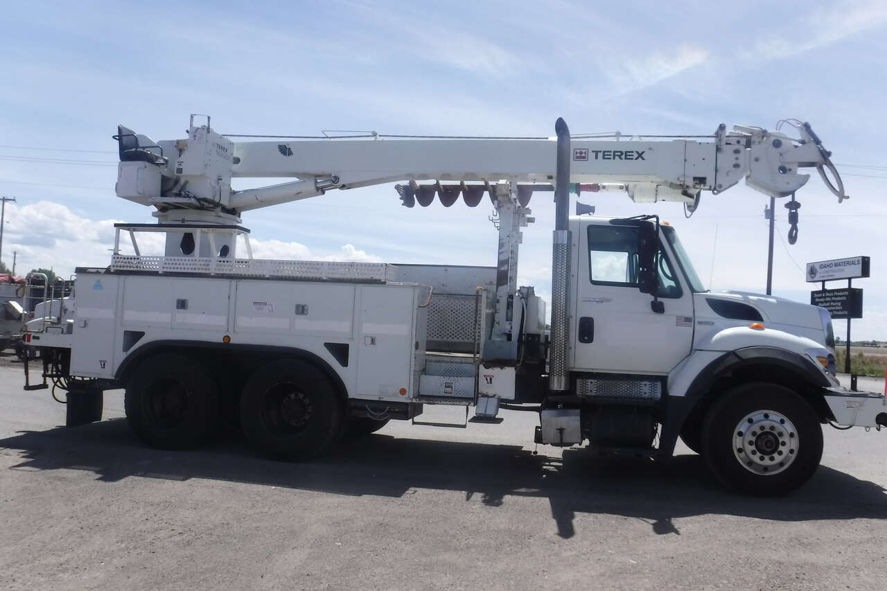 2008 IHC 7600 Digger Derrick crane with Telelect Commander crane and auger. 30,000 LB. lift. 54 FT. Reach sheave ht. 3 section hyd. boom. 2 spd digger heel winch. Pole grab. 4 hyd. outriggers. 3000 watt invertor. Mounted on a 2008 IHC 76006X4 tandem axle truck with utility bed. 9.3 Diesel with Fuller 10 speed trans. PS,AC. Front winch and capstan. 90% 11R/22.5 Radial tires. RUST FREE. One owner former PUC truck that has had excellent fleet maintenance and runs and drives like new. All systems work properly. Excellent for power line work or construction crane. $39,900. Located in Twin Falls Idaho. Call 208-613-0050.
