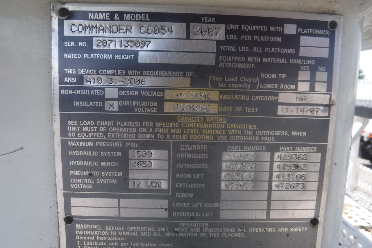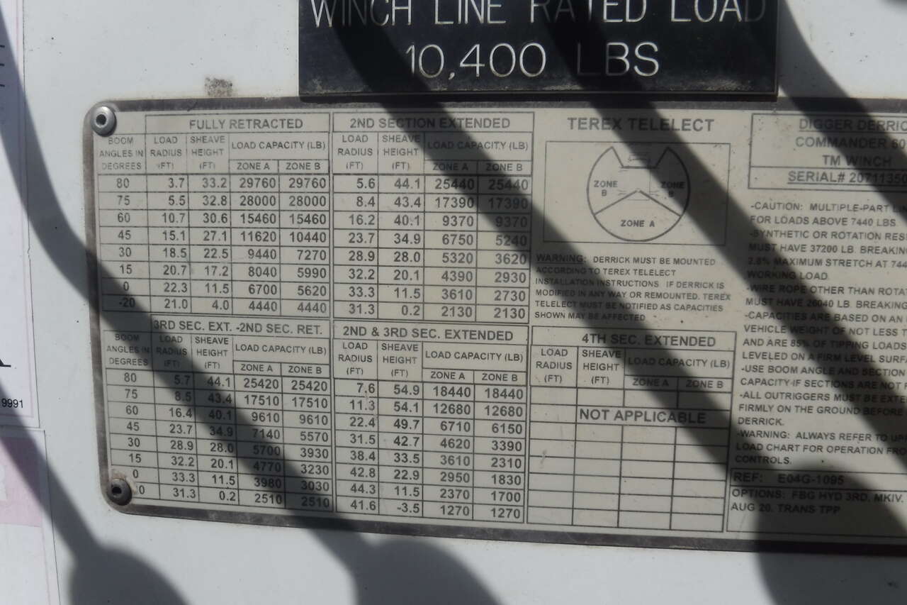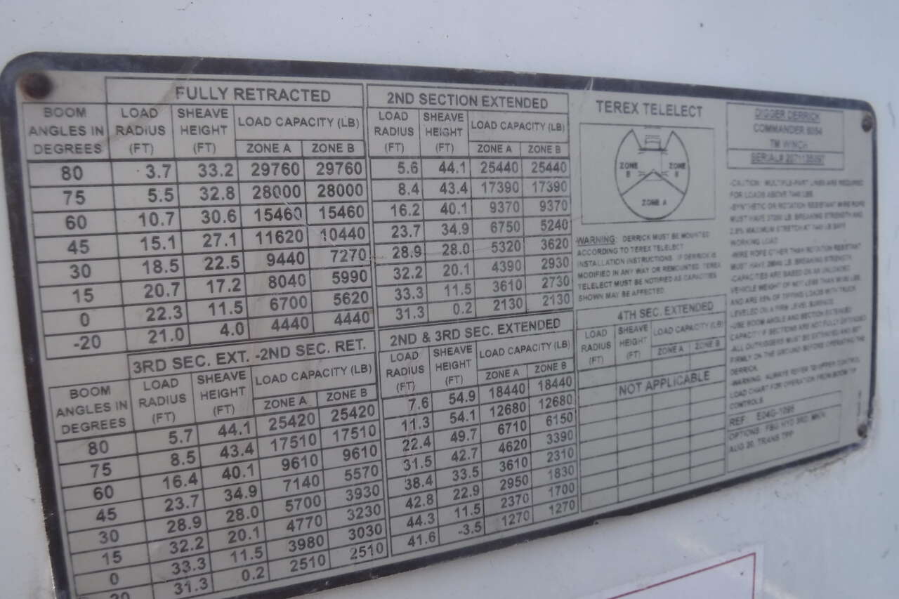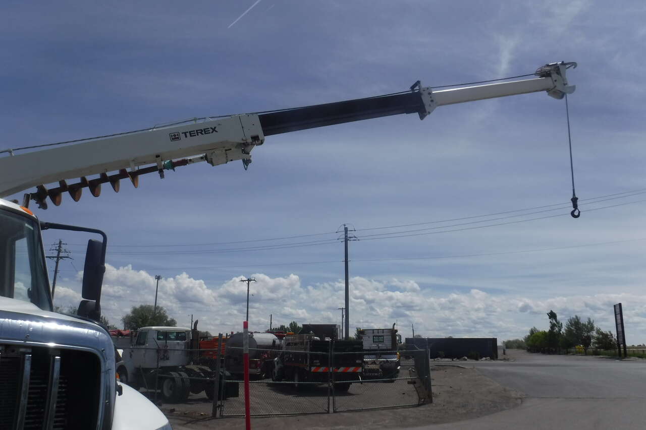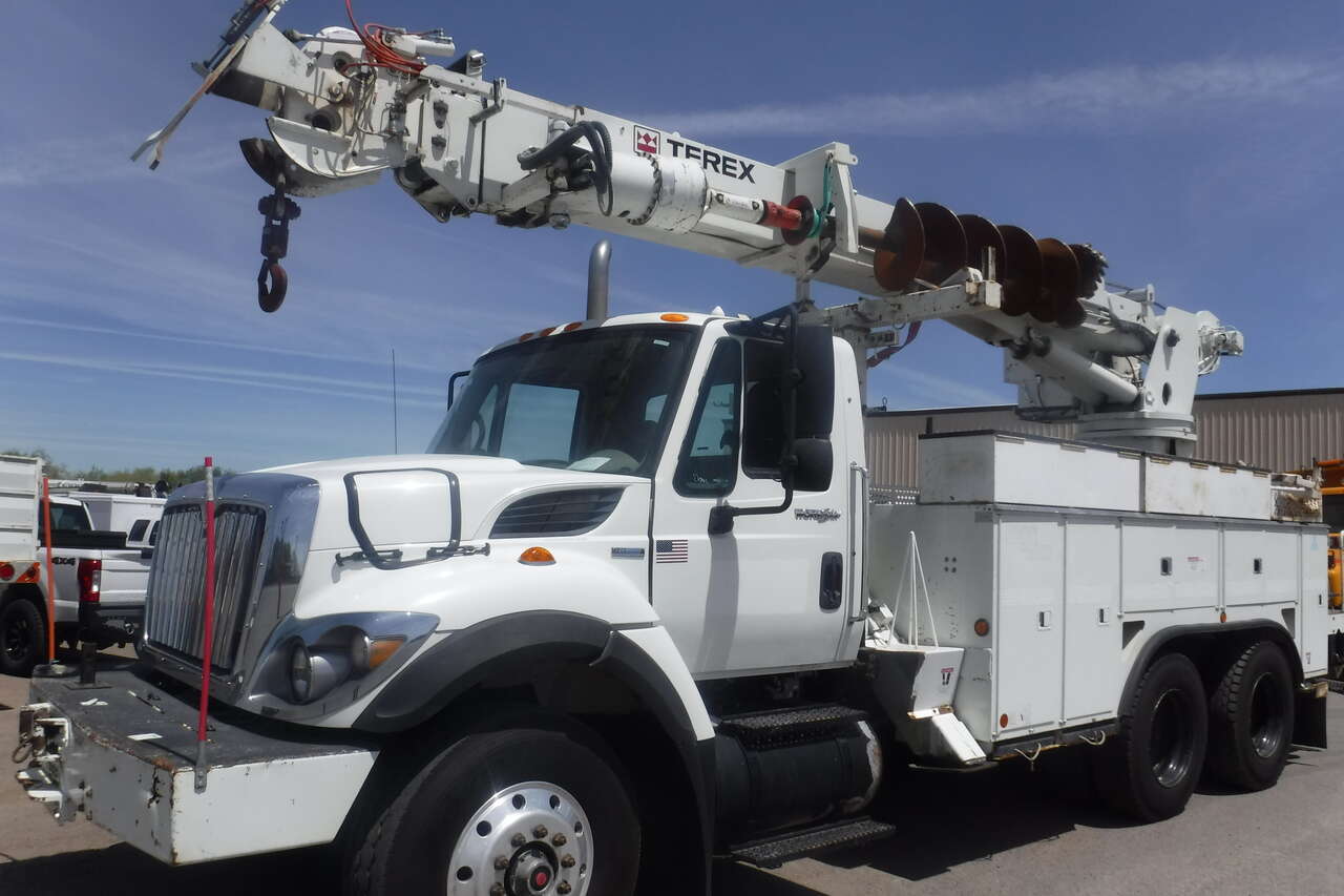 2008 IHC 7600 Digger Derrick crane with Telelect Commander crane and auger. 30,000 LB. lift. 54 FT. Reach sheave ht. 3 section hyd. boom. 2 spd digger heel winch. Pole grab. 4 hyd. outriggers. 3000 watt invertor. Mounted on a 2008 IHC 76006X4 tandem axle truck with utility bed. 9.3 Diesel with Fuller 10 speed trans. PS,AC. Front winch and capstan. 90% 11R/22.5 Radial tires. RUST FREE. One owner former PUC truck that has had excellent fleet maintenance and runs and drives like new. All systems work properly. Excellent for power line work or construction crane. $39,900. Located in Twin Falls Idaho. Call 208-613-0050.