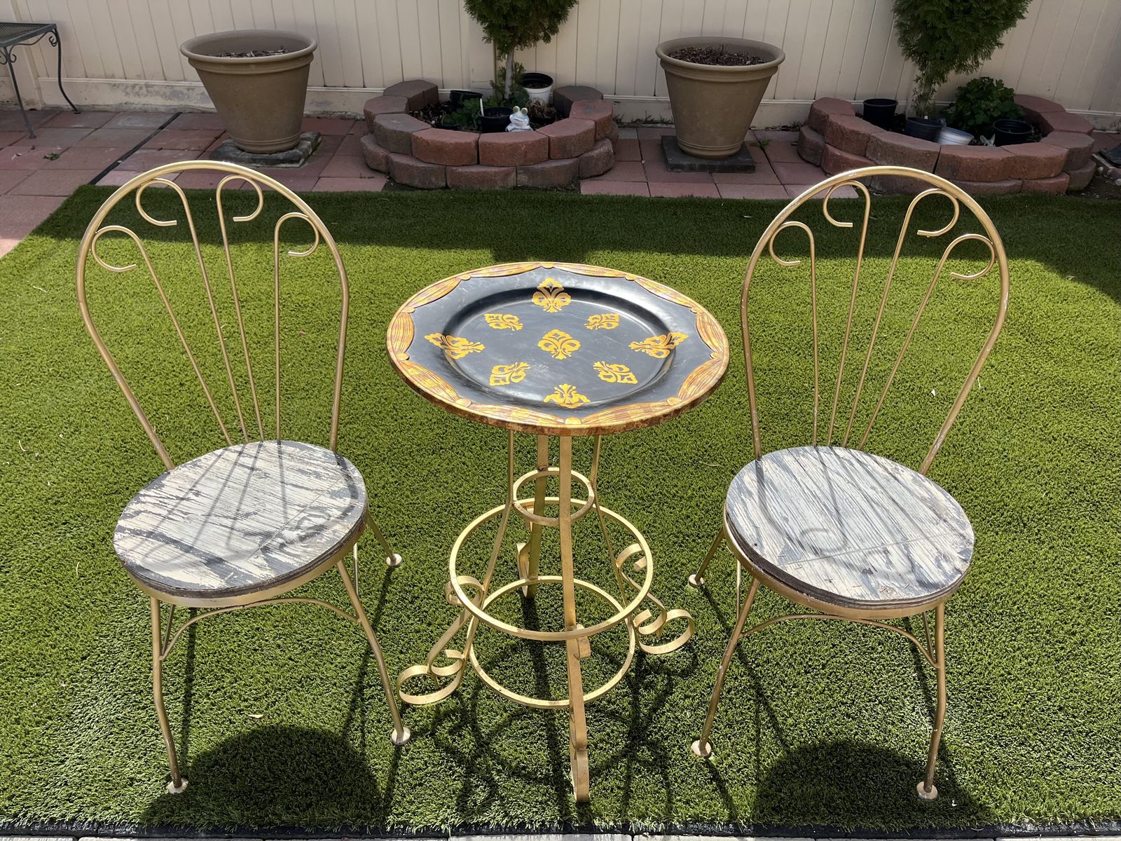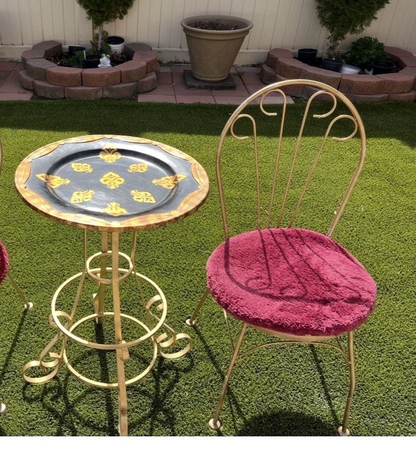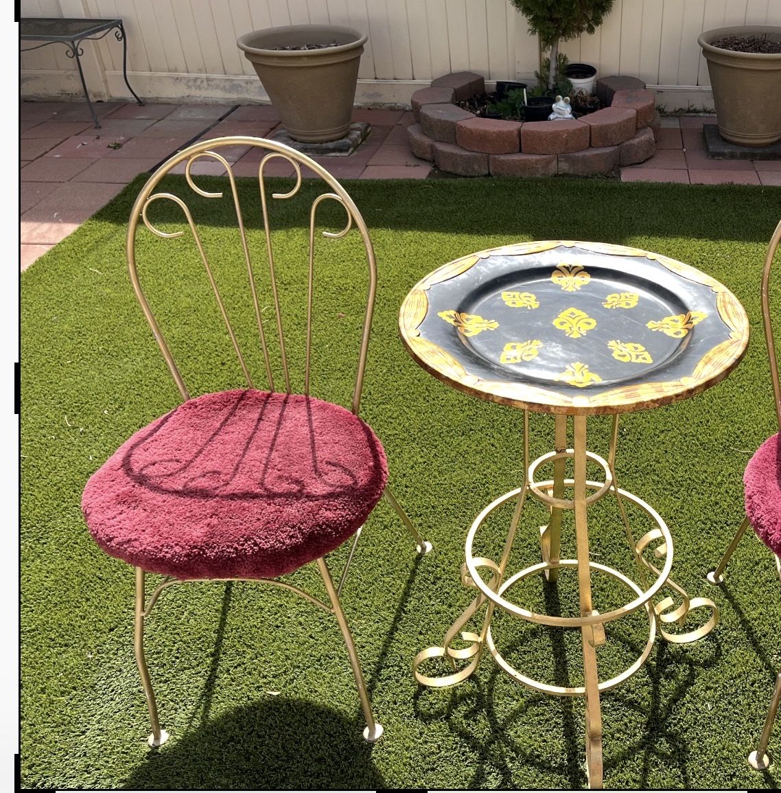 VenmoCharming Bistro set of 3: 19” in diameter x 30” tall black- gold round side/serving table. Super heavy, sturdy. Two metal chairs are: 15” (seat) x 17”-36” (high). Good for indoor and outdoor use. $35 each or $100 for whole set.