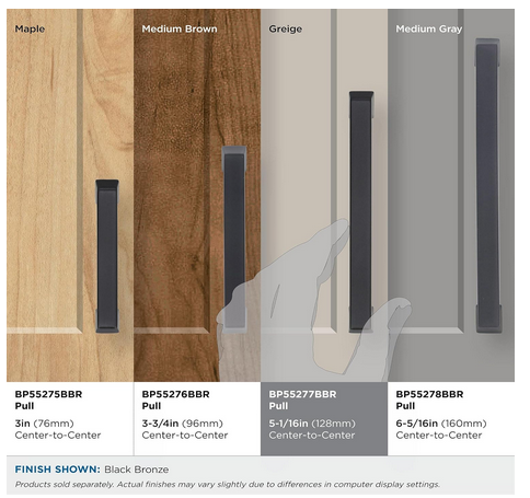 VenmoThe Amerock BP55277BBR Blackrock 5-1/16 in. (128 mm) Center-to-Center Pull is finished in Black Bronze. Inspired by hard geometric lines, Blackrock's simple shapes make a lasting impression. Black Bronze is a warm and slightly textured dark finish which nods to the softer side of Black without losing the richness of the Bronze feel.