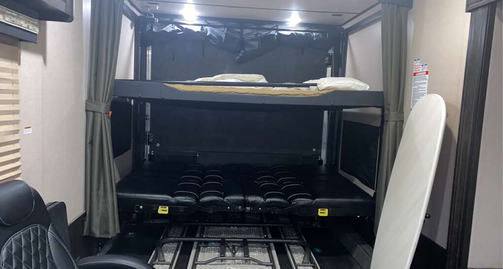 I have a 2019 xlr hyper lite toy hauler M-30HFX this has been a great trailer we are the only owners it has 20 feet of storage so it will fit any four seater side by side no problem and more we just installed new batteries this year the rear gate will stay up for a deck it has the rail to go around the deck also bunk beds in the rear the couch folds out to a bed and the queen bed up front for plenty of space to sleep it has a 30 gallon fuel station also powers the onboard generator it has two ac units to keep it nice and cool on the hot summer days and heater to keep it warm electric jack on the front power awning with wind sensor it also comes with everything you’ll need to get started and equalizer hitch this has been a great trailer but we are wanting to get a fifth wheel call or text with any questions text is preferred