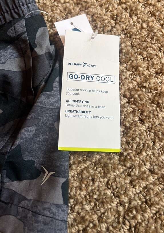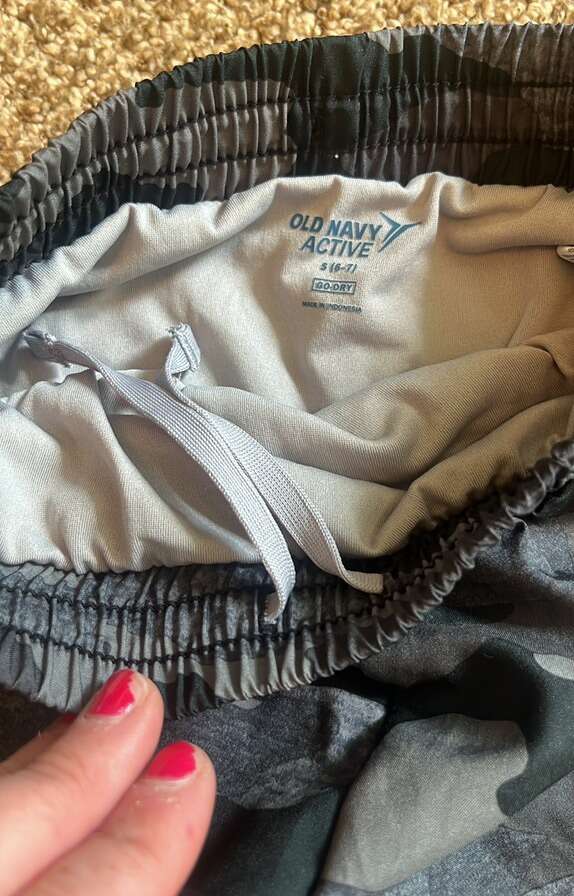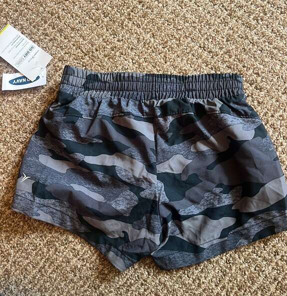 Brand new with tags Old Navy Grey/black camo color Elastic waist band with drawstring Vented back at each leg opening Built in brief liner 100% polyester (Picture of model is in green camo- please note this is for grey camo, reference picture just for fit and style) Small is (6-7) Medium is (8) XL (14)