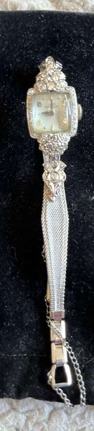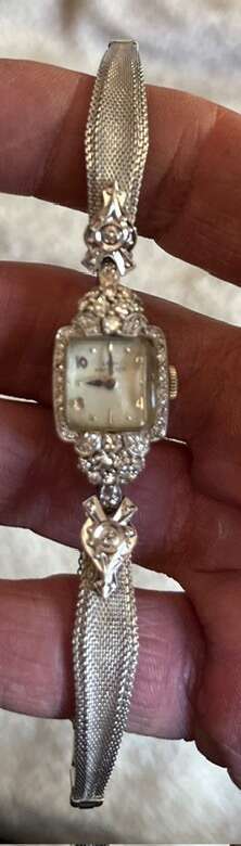 14kt 1.50 kt of diamonds. Just need a battery. 17 jewel gears. Cash or venmo NO CODES wound to tight need to be fixed. Other then that it is beautiful real white gold and 1.5 kt.