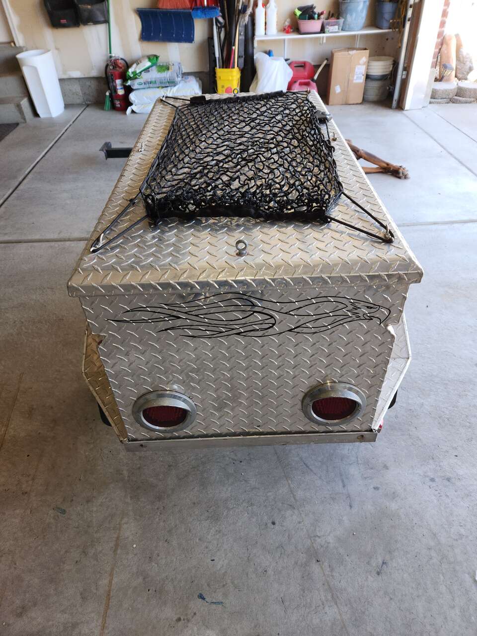 All aluminum skid plate trailer for motorcycle. Hitch and swivel (to allow more lean without stressing hitch and ball, LED tail lights, two forward looking projection fog lamps (lights up bike and rider(s), padded interior measures 22X45X18, cargo net, cargo pad (holds coolers nicely), and spare tire. Asking $3000.00 obo. Text and messaging are best.