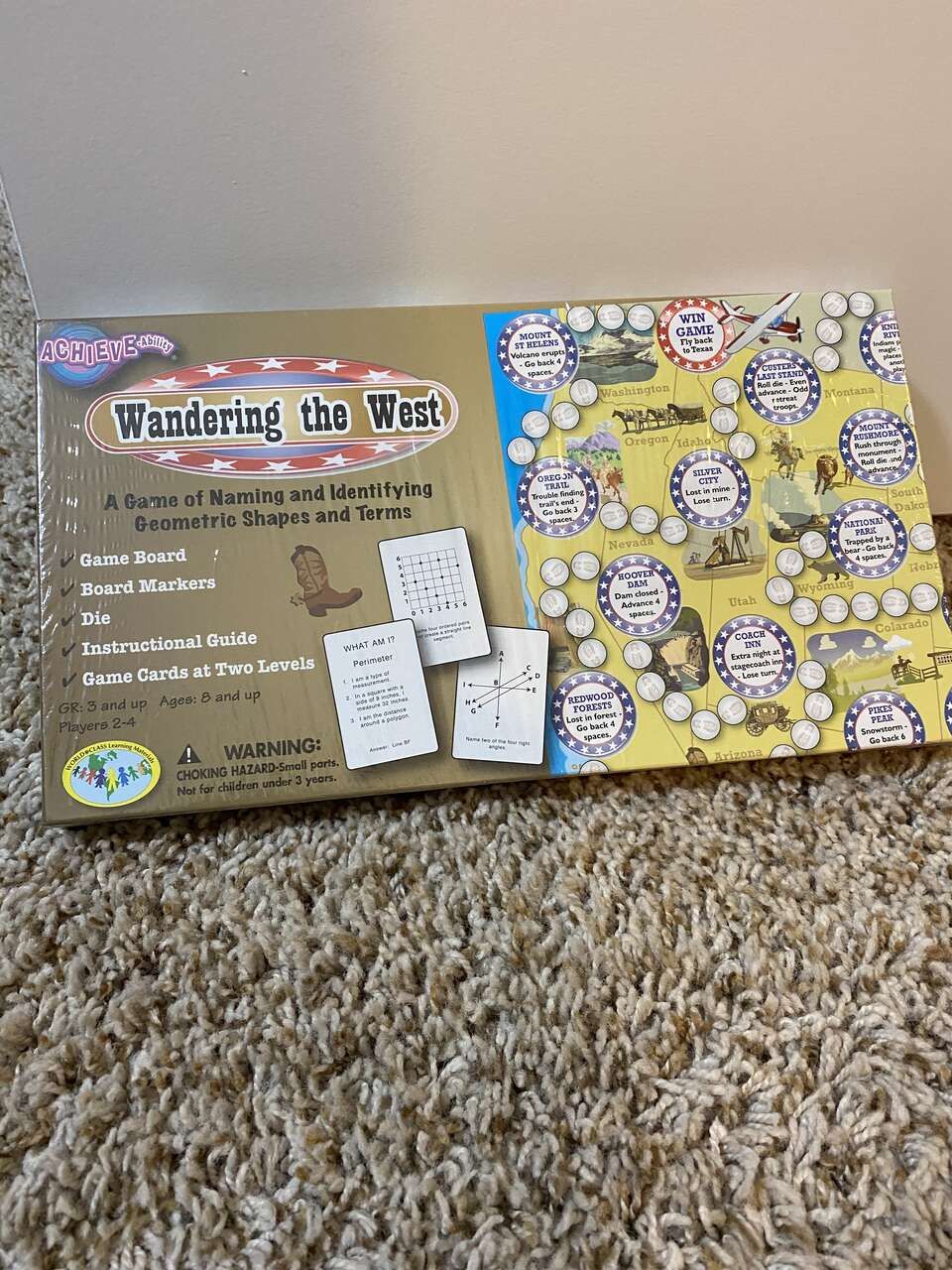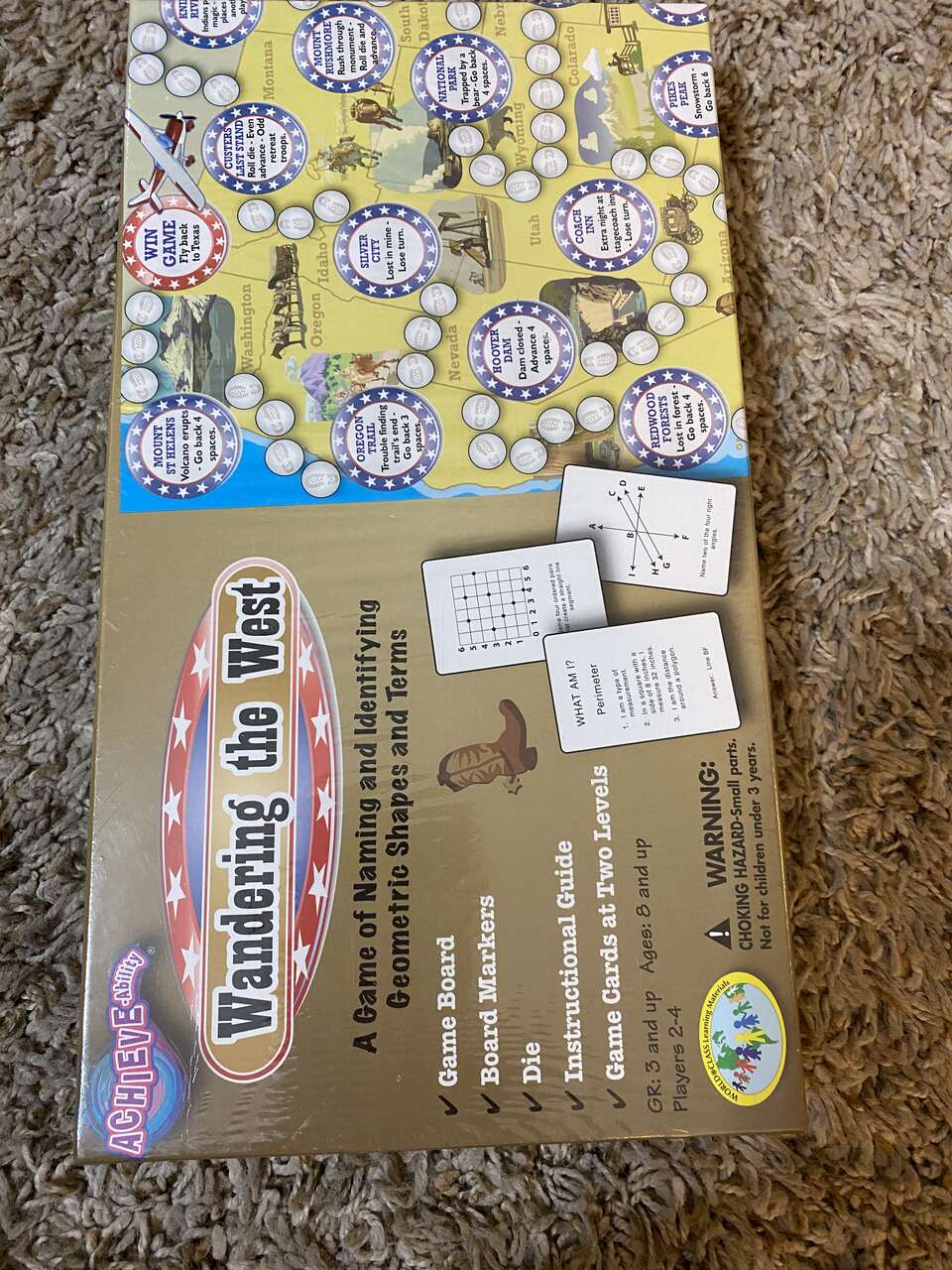 VenmoThree educational board games that were bought and never opened, still in the plastic. Wandering the West focuses on naming and identifying geometric shapes and terms for grades 3 and up (ages 8 and up) this game can be played with 2-4 players with two game card levels. The other one is European Adventure a game of writing and identifying algebraic equations and expressions for grade 3 and up (ages 8+) can be played with 2-4 players with game cards on two levels. The other game is The Great Race Across China a game of solvinf for unknown variables in algebraic equations for grade 4 and up (ages 9+) can be played with 2-4 players with game cards on two levels.