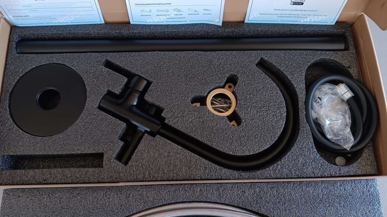 PACKAGE CONTENTS (See pics): Package includes bathtub faucet (crafted from high quality brass), brass tube, hand shower(MISSING hand shower but has hose ) with 60" double spiral stainless steel hose, 35" Hot and Cold water inlet hoses, metal tripod with mounting hardware, base cover and installation instruction.