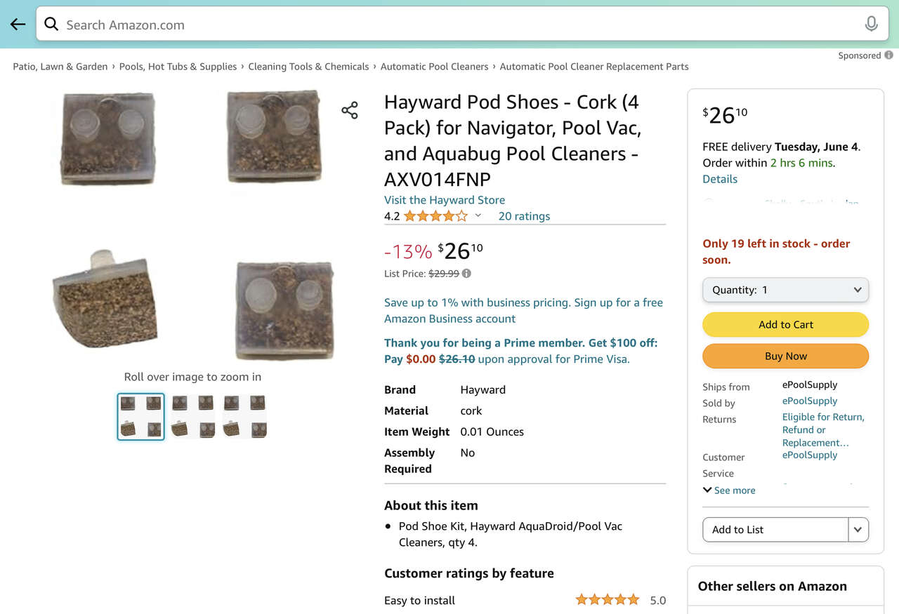 NEW - Hayward Pool Cleaner Replacement CORK Pool Shoes - 2 Pair - See Photos. The sale price on Amazon is 26+ per Set of 4. You get 2 SETS of 4 for $30