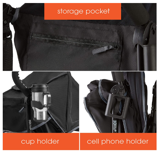 ADDITIONAL FEATURES: A parent cup holder, cell phone holder, zip-close storage pocket, child sippy cup holder, compact fold with auto-lock & carry strap, anti-shock front wheels & lockable rear wheels.