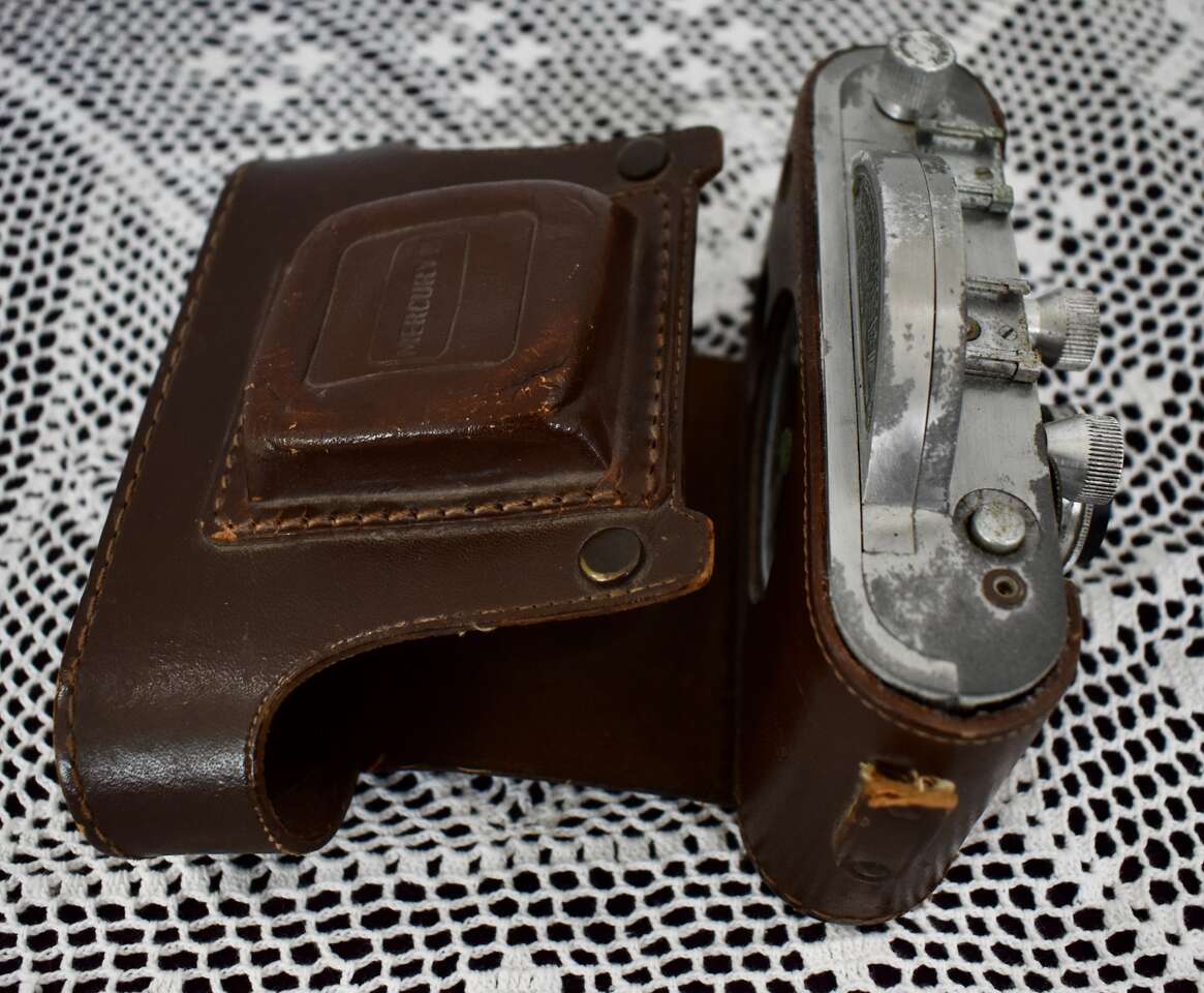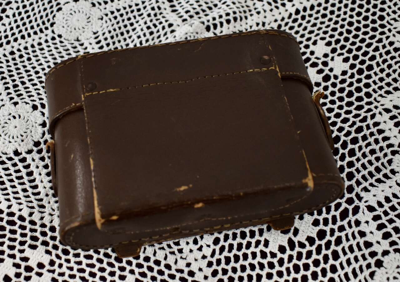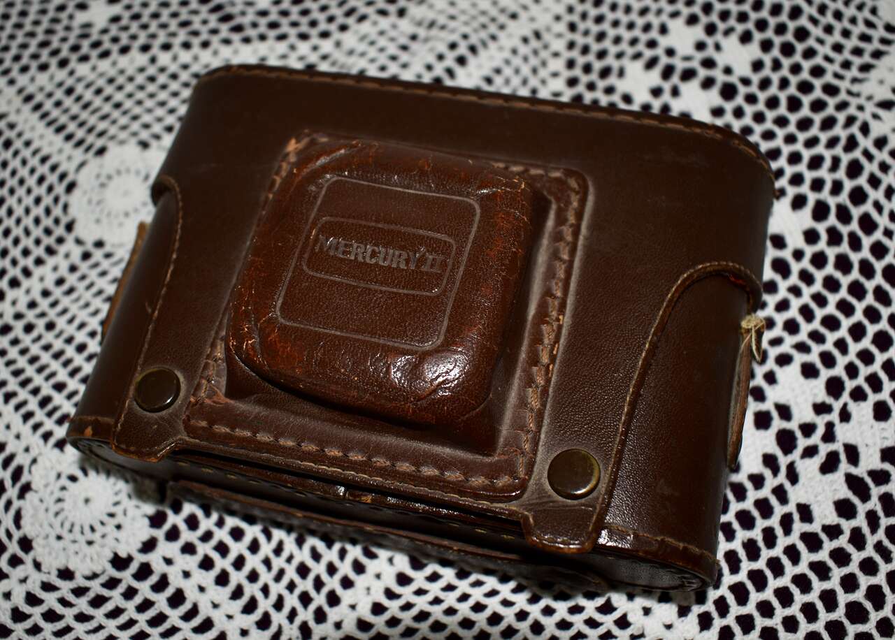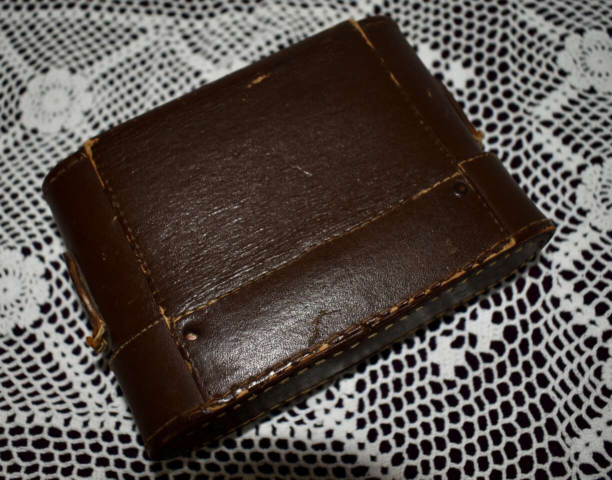 IT MEASURES… The Camera Measures… Approx. 5 3/4 inches wide and 3 1/2 inches tall and it is 2 inches thick measured at the center area. The brown Leather case measures… Approx. 6 1/2 inches wide - 4 inches tall.
