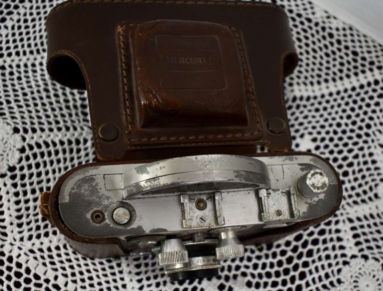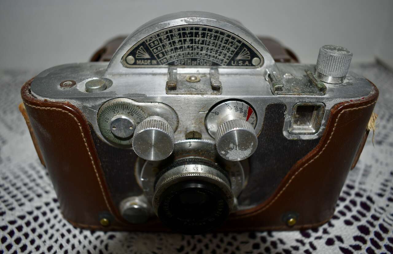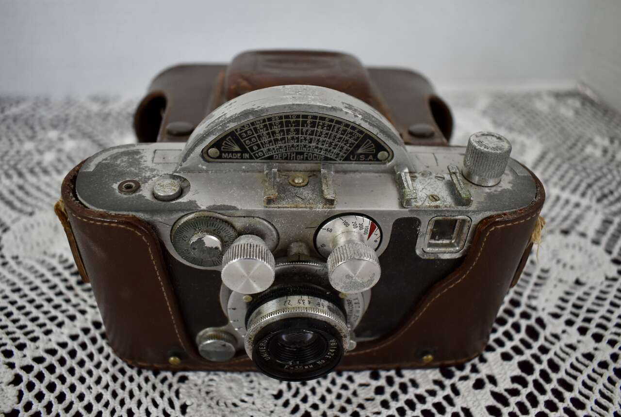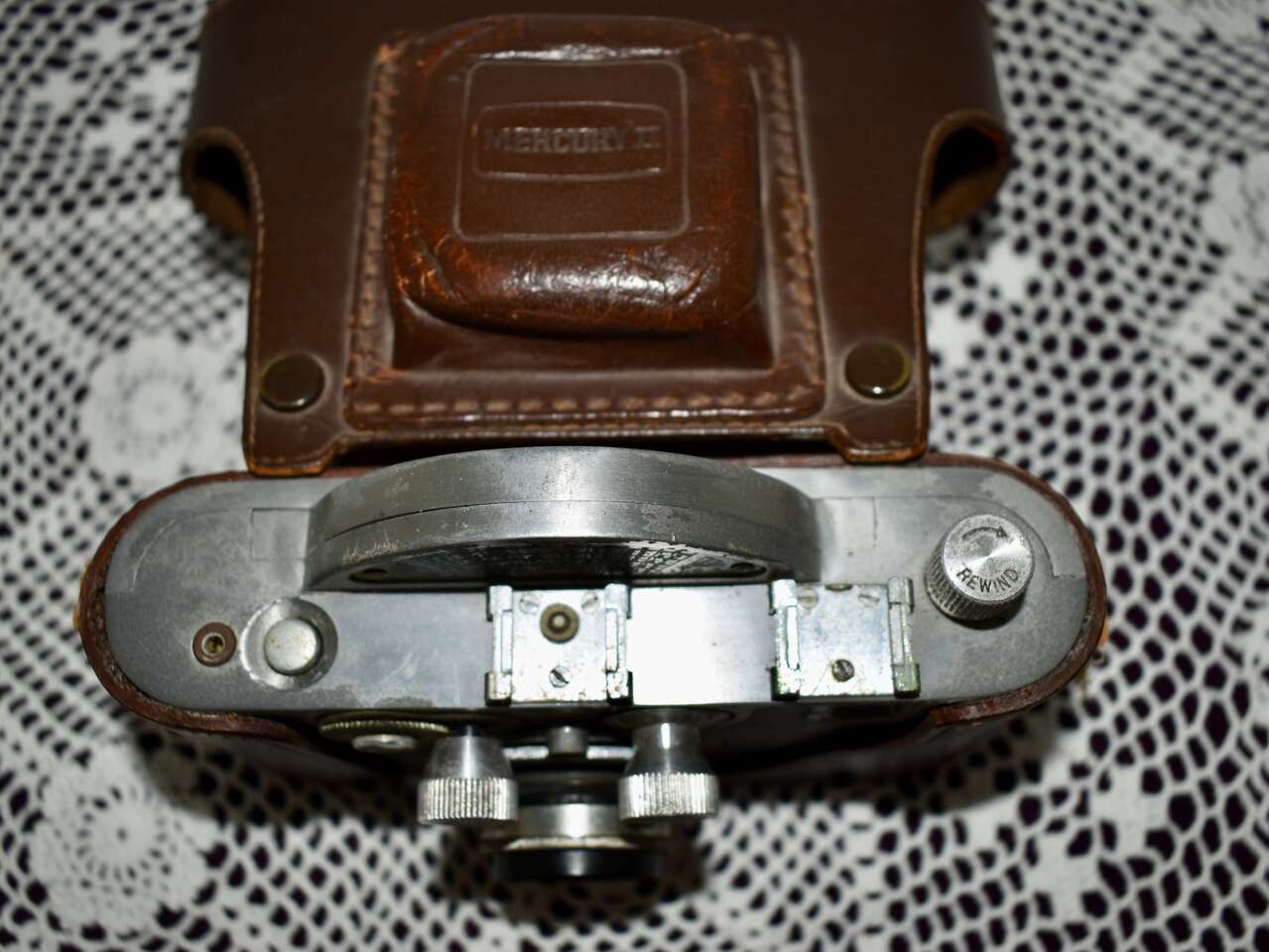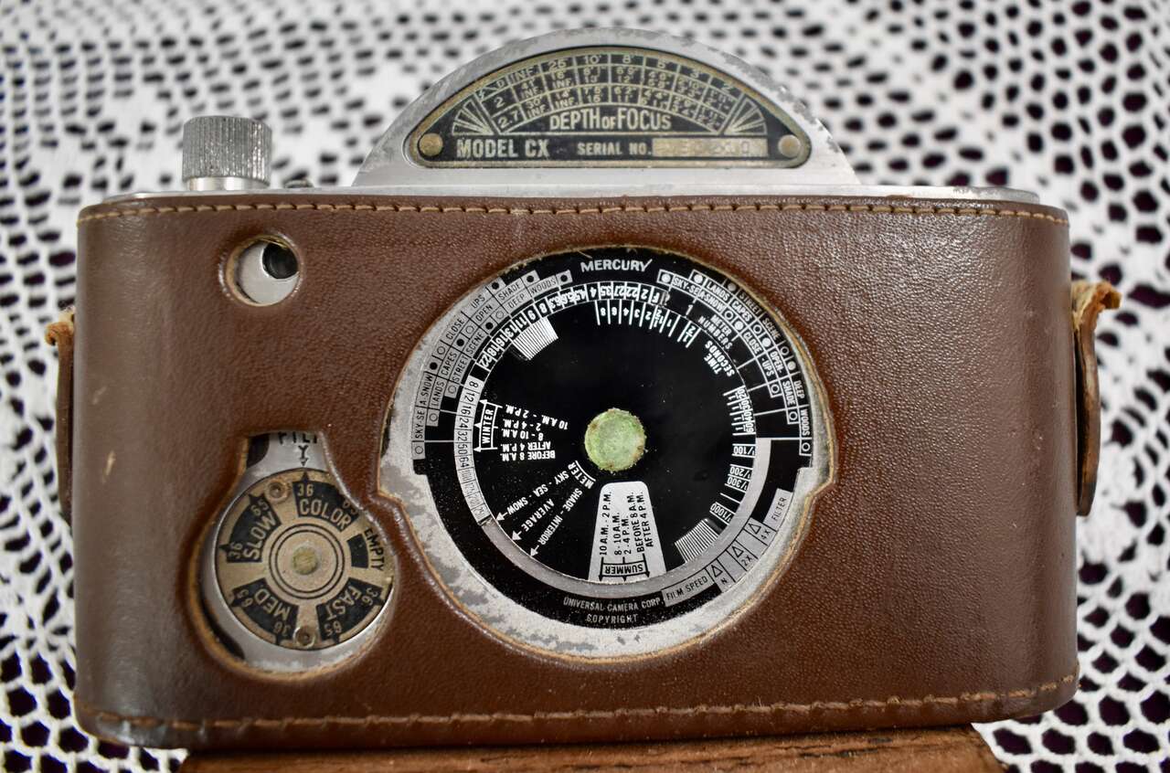 IT MEASURES… The Camera Measures… Approx. 5 3/4 inches wide and 3 1/2 inches tall and it is 2 inches thick measured at the center area. The brown Leather case measures… Approx. 6 1/2 inches wide - 4 inches tall.