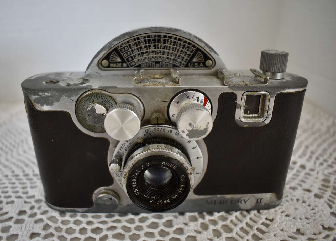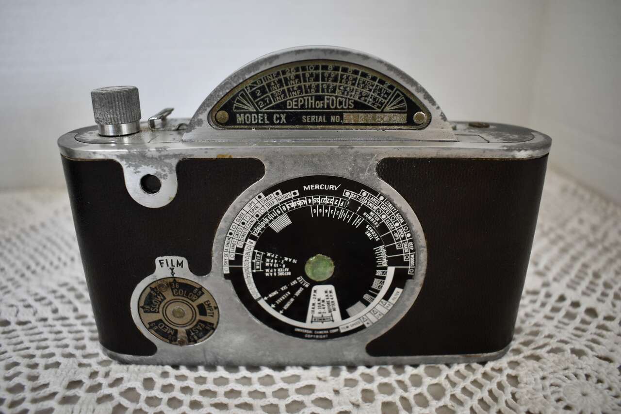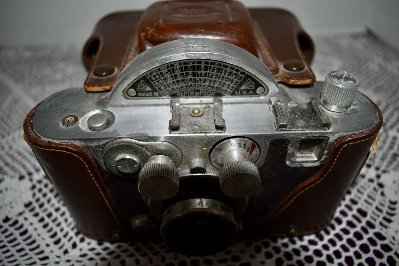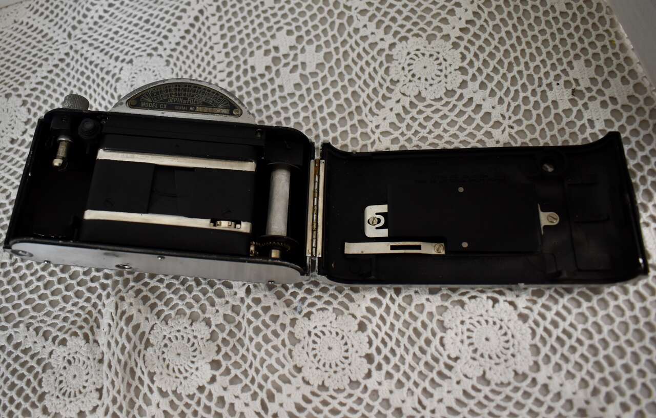 IT MEASURES… The Camera Measures… Approx. 5 3/4 inches wide and 3 1/2 inches tall and it is 2 inches thick measured at the center area. The brown Leather case measures… Approx. 6 1/2 inches wide - 4 inches tall.
