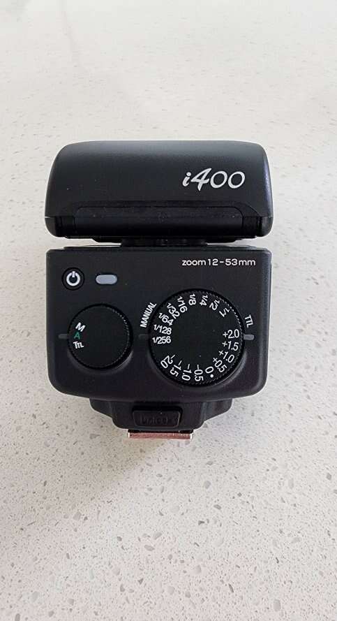 Compatible with Canon Nikon Sony Fujifilm Lumix The i400 is a simple clip-on strobe with three light-firing modes: fully auto, TTL, and manual. Simple to operate. By simply turning the dial To change the light emission mode, simply turn the mode dial, and to change the light emission amount, simply turn the light intensity dial. It can be operated intuitively. The light intensity can be adjusted in 1/2EV steps for TTL dimming and 1EV steps for manual dimming. Maximum GN40 (at ISO 100/m and irradiation angle 105 mm) Although it is a small body, the guide number is up to 40. It is a clip-on strobe with a small size but a powerful amount of light. Light-emitting head rotation angle of 180 degrees left and right and 90 degrees upward The light-emitting head can be moved 90 degrees upward and 180 degrees left and right. Powered with 4 AA batteries. despite its small size. \