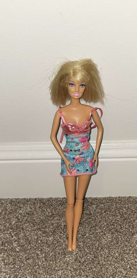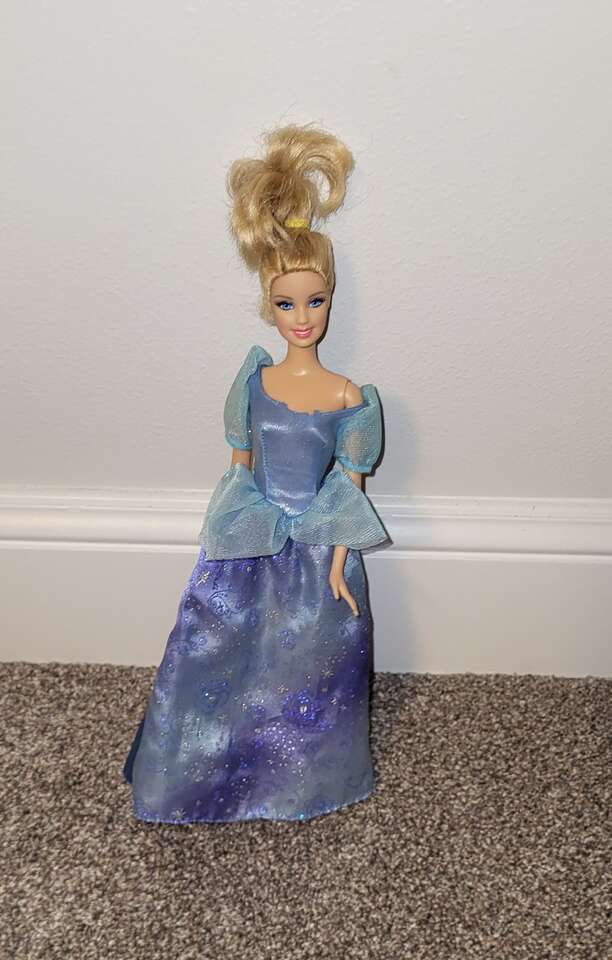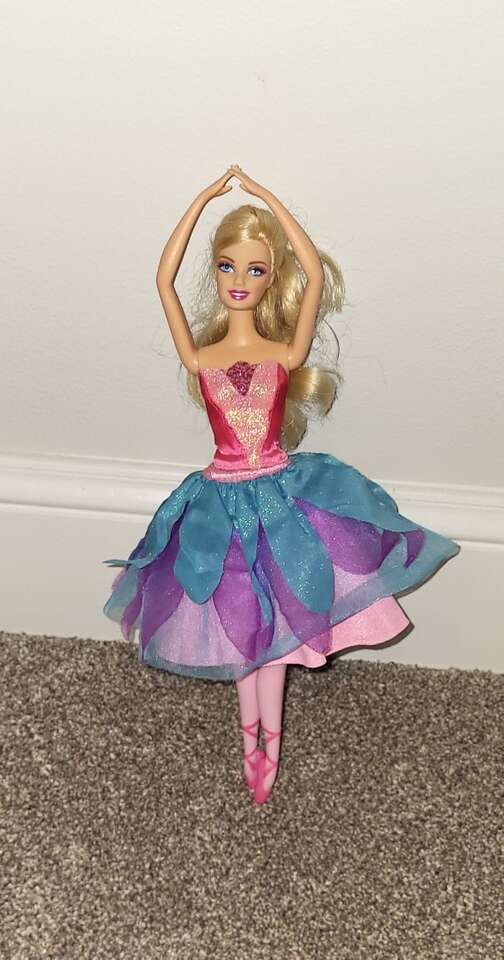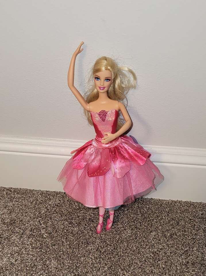 5 total Includes: Girl in cinderella dress, Barbie in the Pink Shoes Kristyn Farraday Transforming Ballerina-dress switches to different skirts as seen in picture, girl in cinderella dress, girl in one piece orange shirt and jeans, girl in blue dress with bow pattern