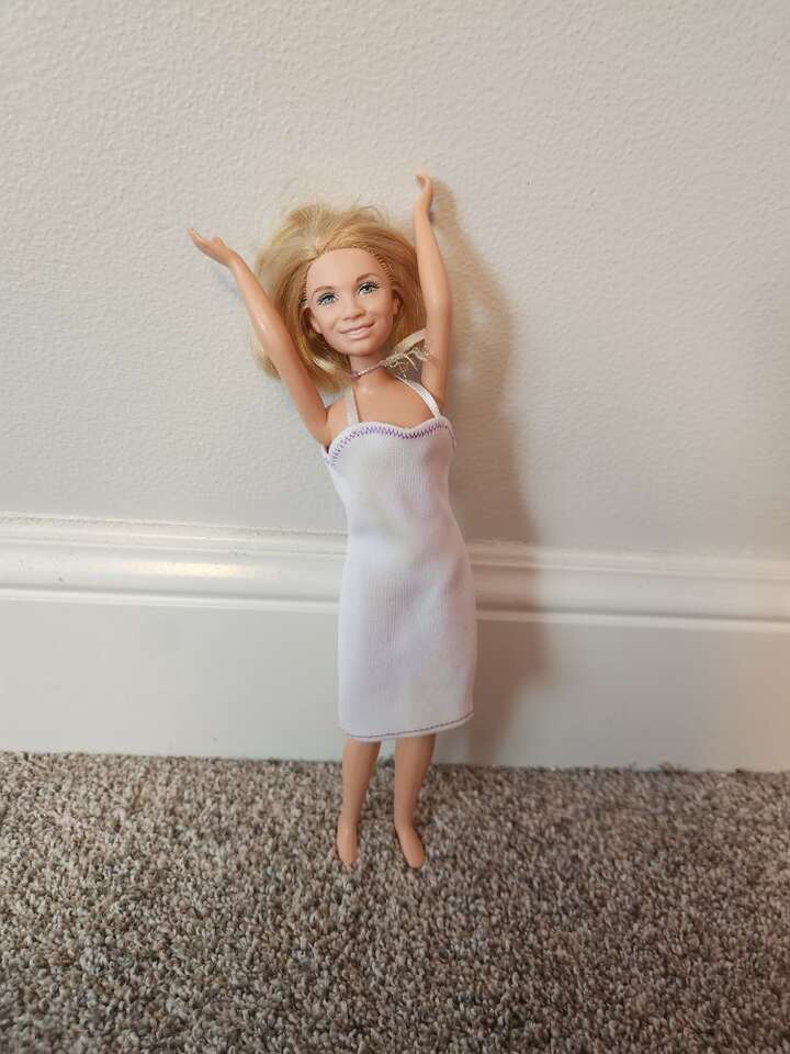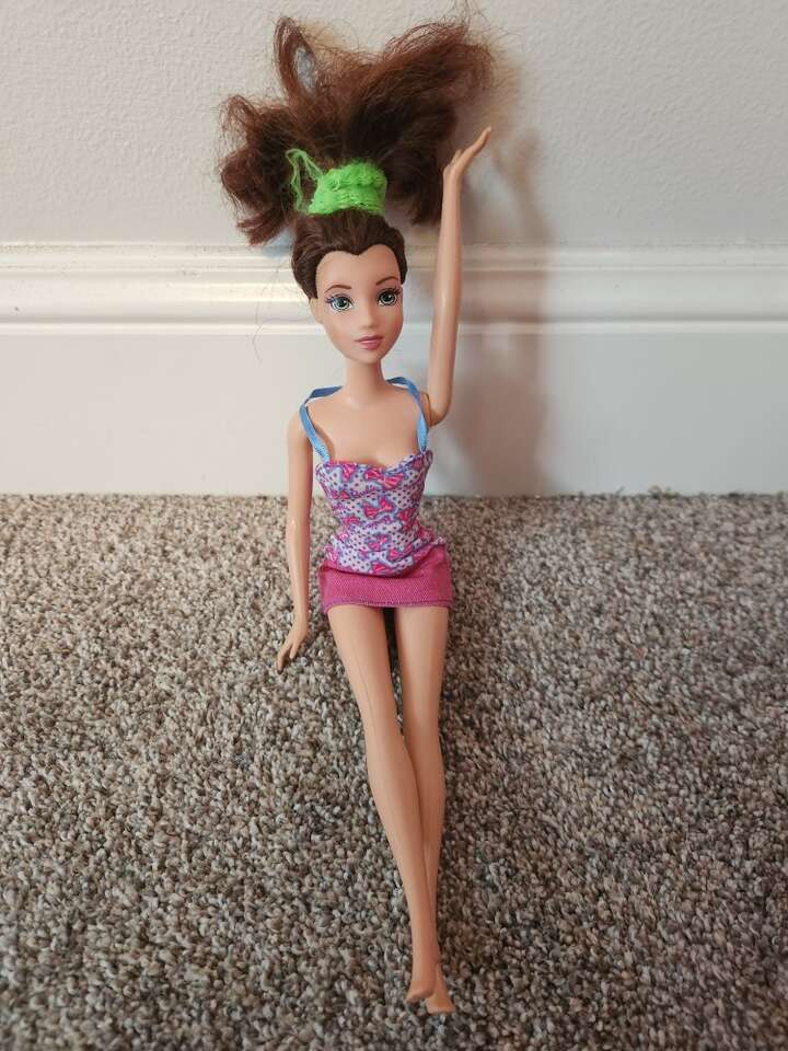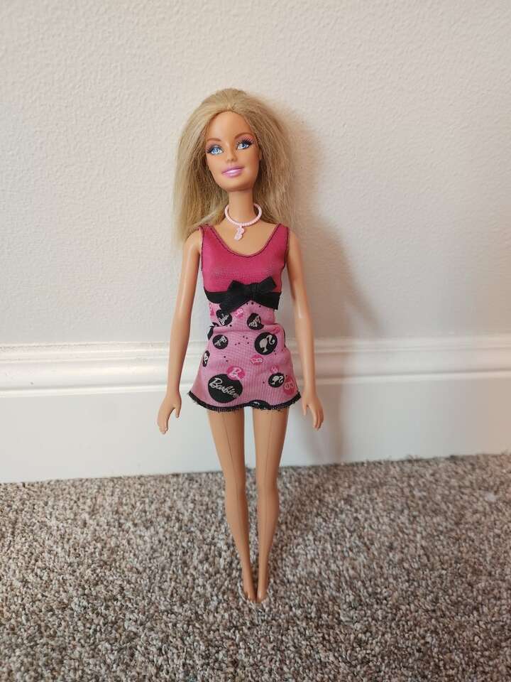 5 Total Includes: Disney Princess Royal Shimmer MULAN Doll 11" 2015 Hasbro Dress & Blue Shoes, 2015 DC Super Hero Girls Harley Quinn 12" Mattel Action Figure, girl with one-piece white top and bows pattern with pink skirt, short barbie with white color your own dress, and barbie with pink barbie print dress.
