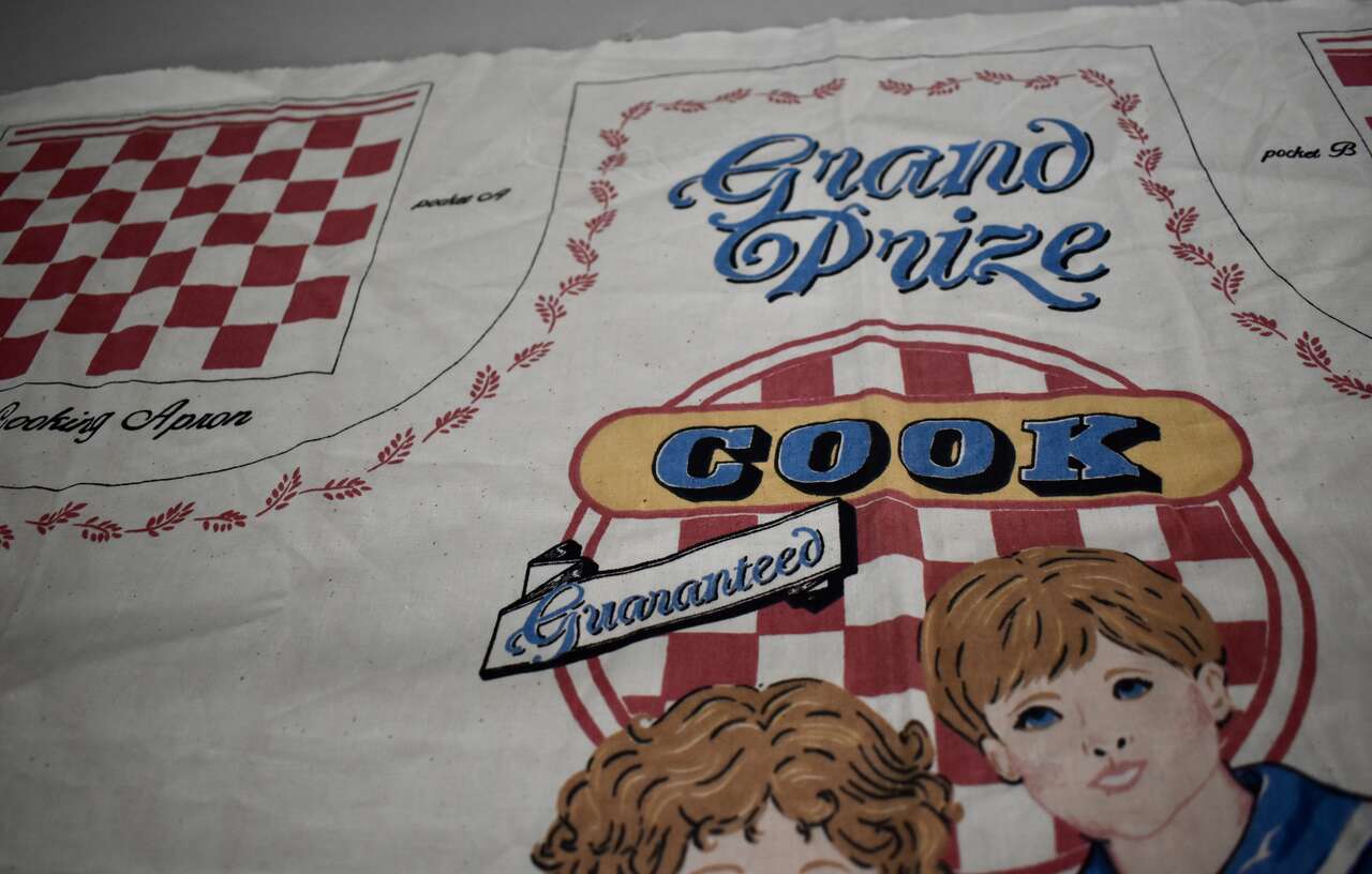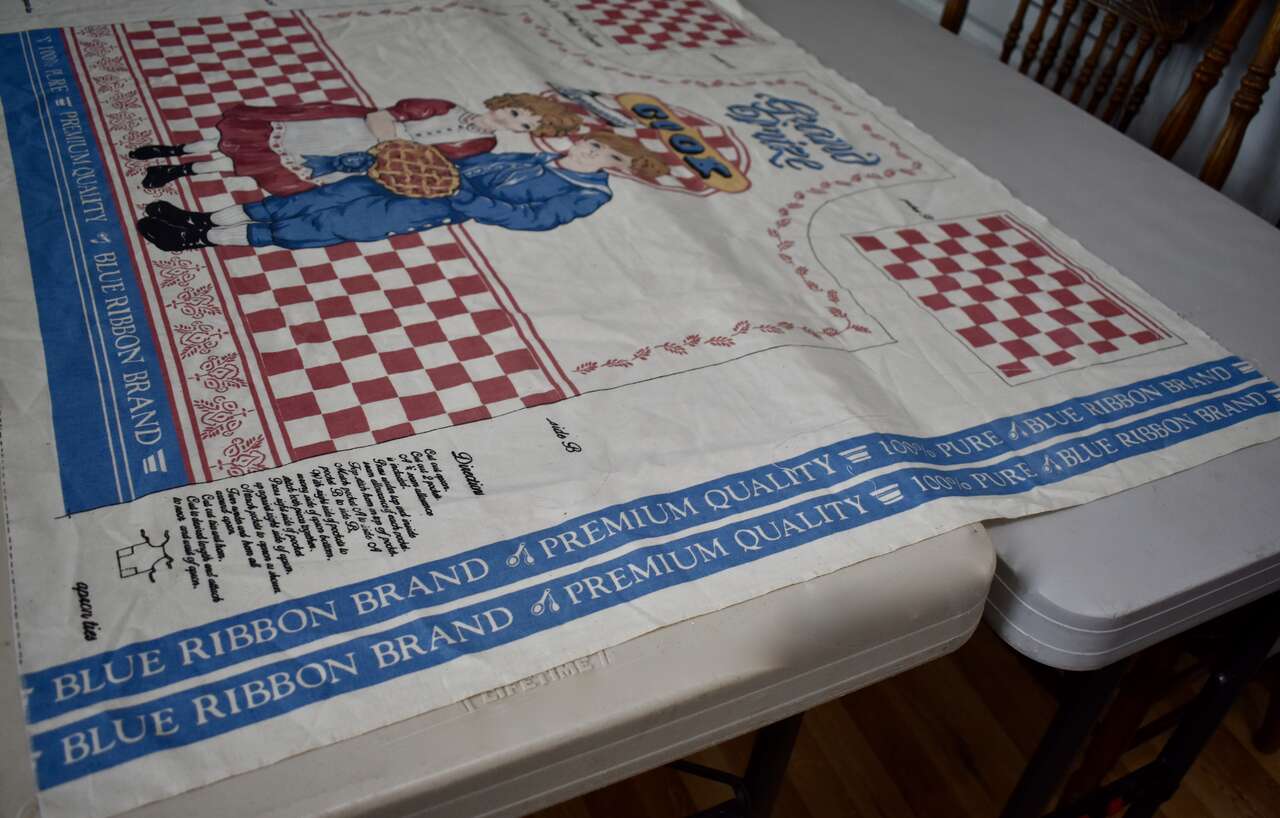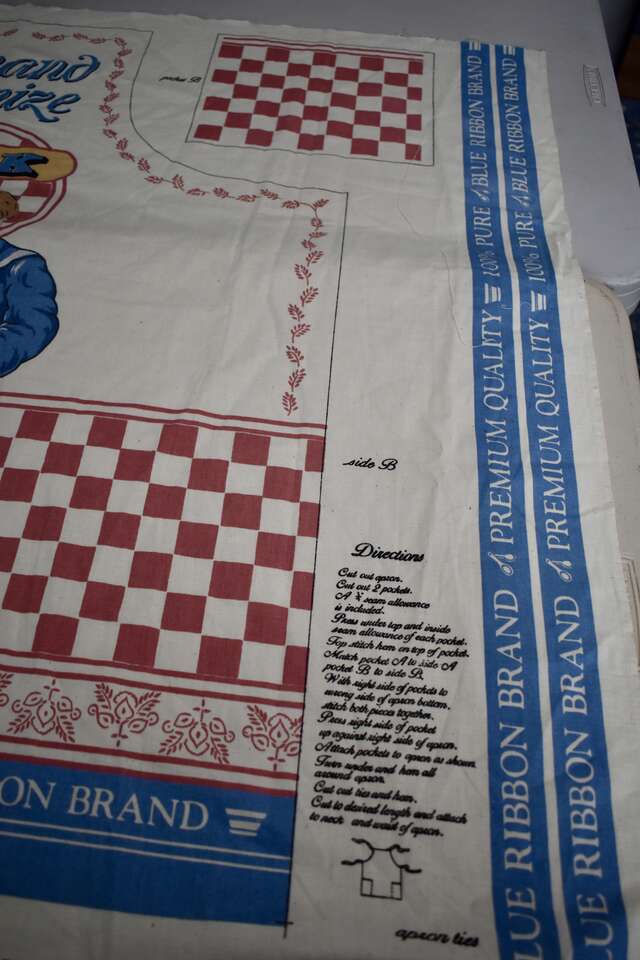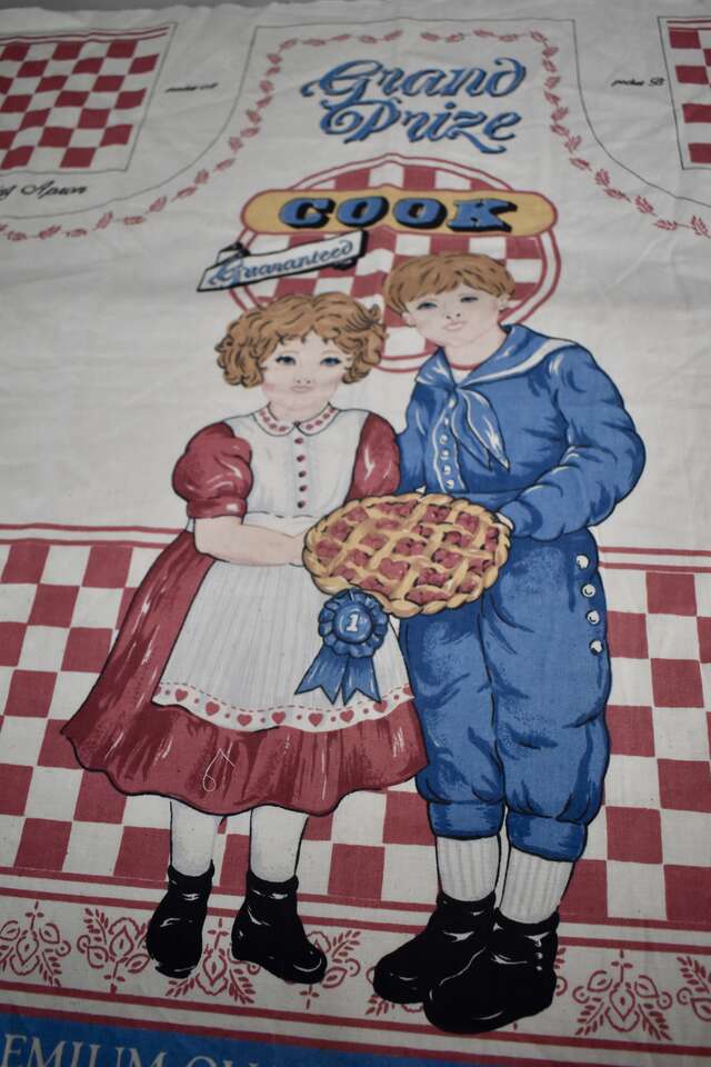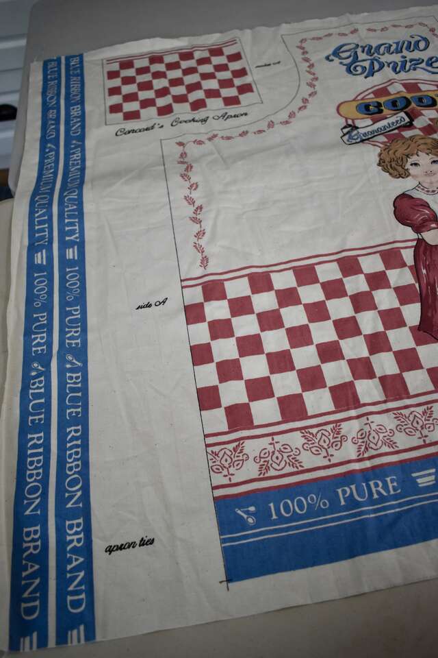 IT MEASURES… The Actual Cotton Panel Fabric Measures… 35 1/2 inches Long X 44 1/2 inches wide. The actual Apron Measures… 33 inches long X 35 3/4 inches wide plus ties for the neck and the waist measures… 35 1/4 inches long X 1 1/4 inches wide.