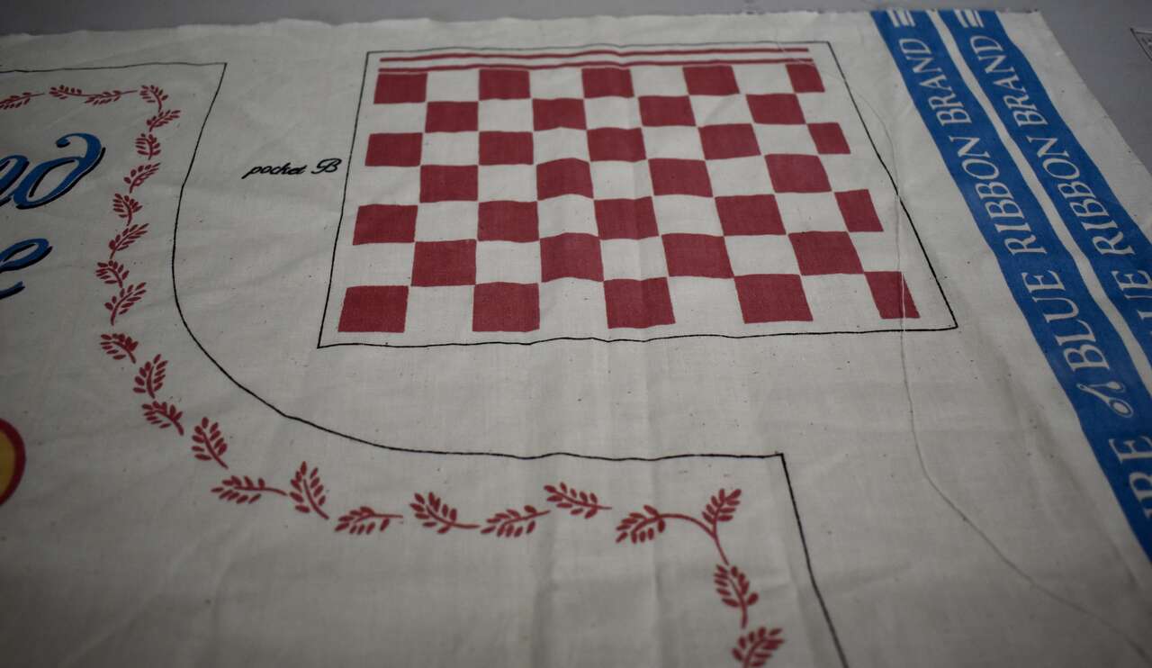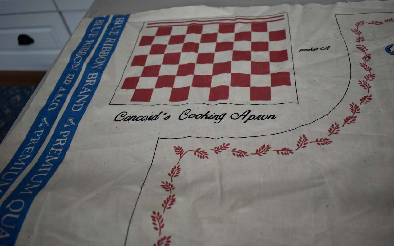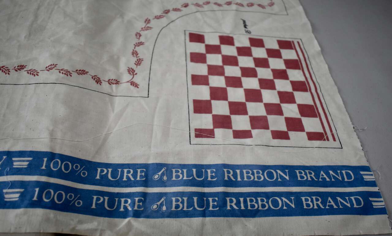 IT MEASURES… The Actual Cotton Panel Fabric Measures… 35 1/2 inches Long X 44 1/2 inches wide. The actual Apron Measures… 33 inches long X 35 3/4 inches wide plus ties for the neck and the waist measures… 35 1/4 inches long X 1 1/4 inches wide.