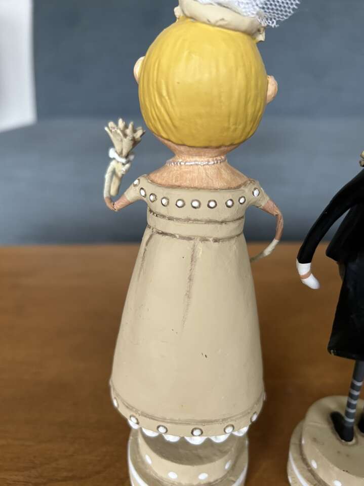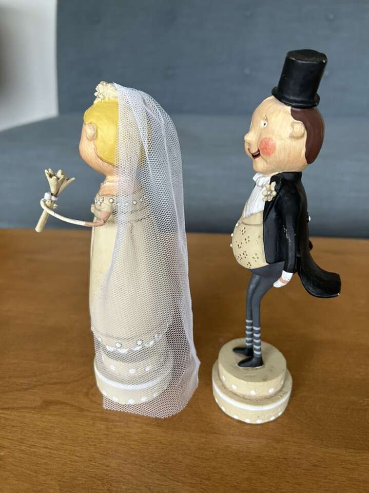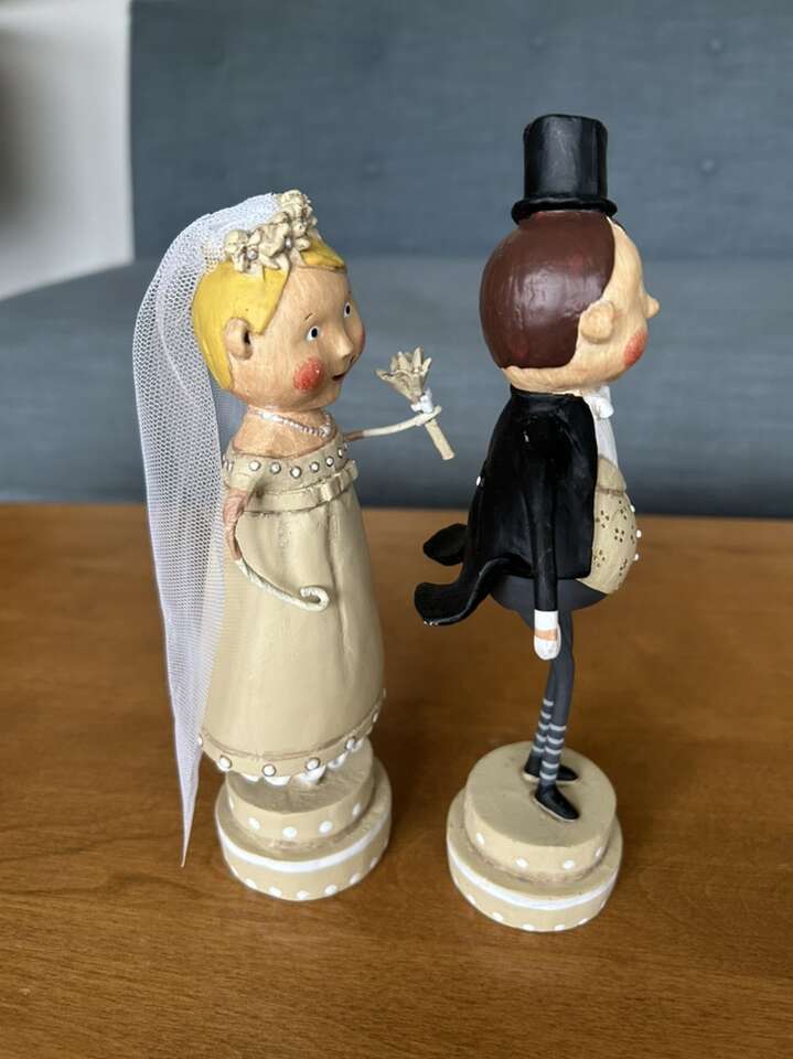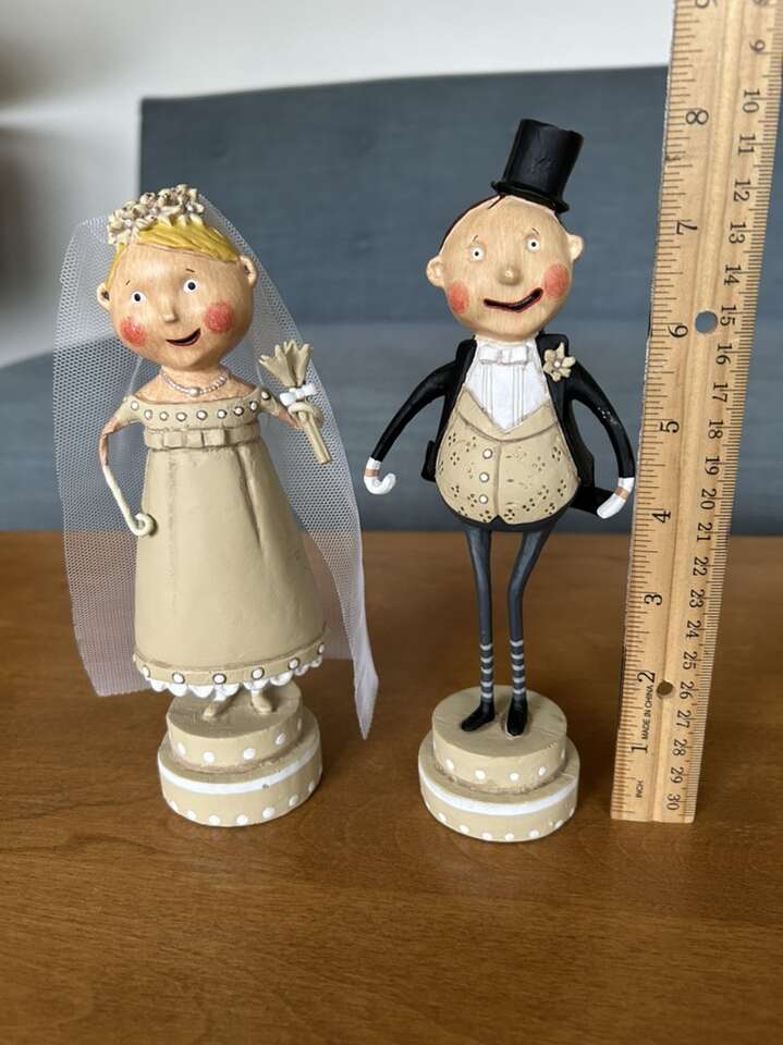Authentic Lori Mitchell Bride and Groom Collectible Figures (Wedding Belle and Lucky Fella). Darling collectible wedding figures, hand-painted resin and wire. Bride with beautiful dress, necklace, veil, and bouquet. Groom in tuxedo, top hat, and boutonnière (missing cane). Could be used as cake toppers. Very good condition. Text only. Cash or Venmo.