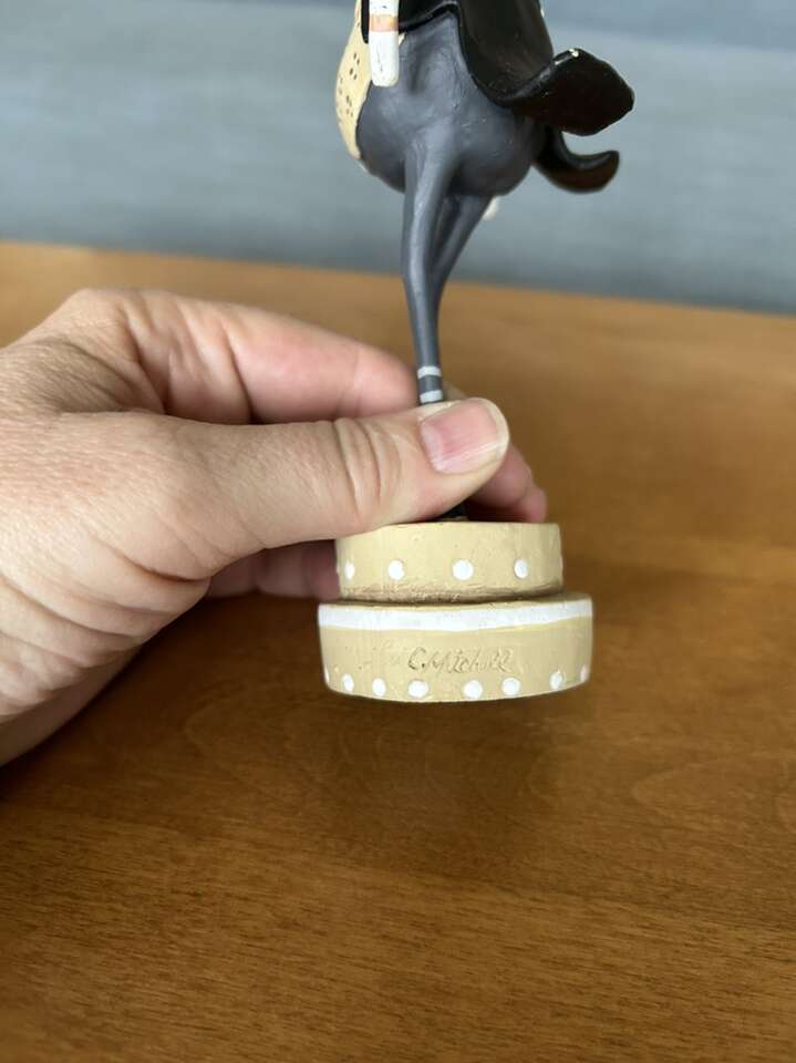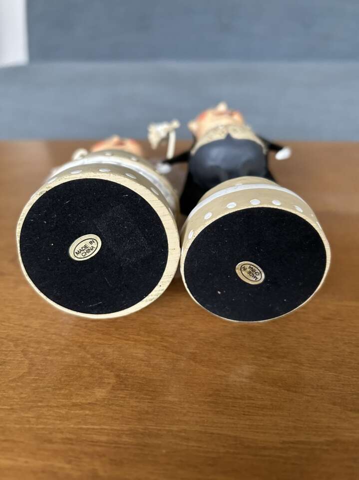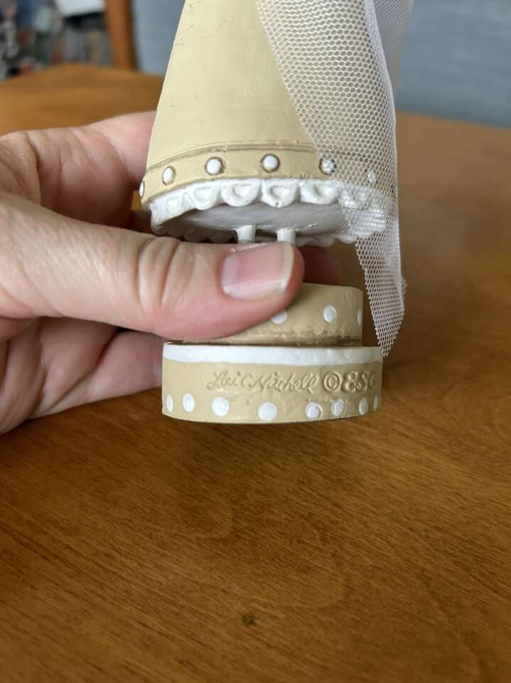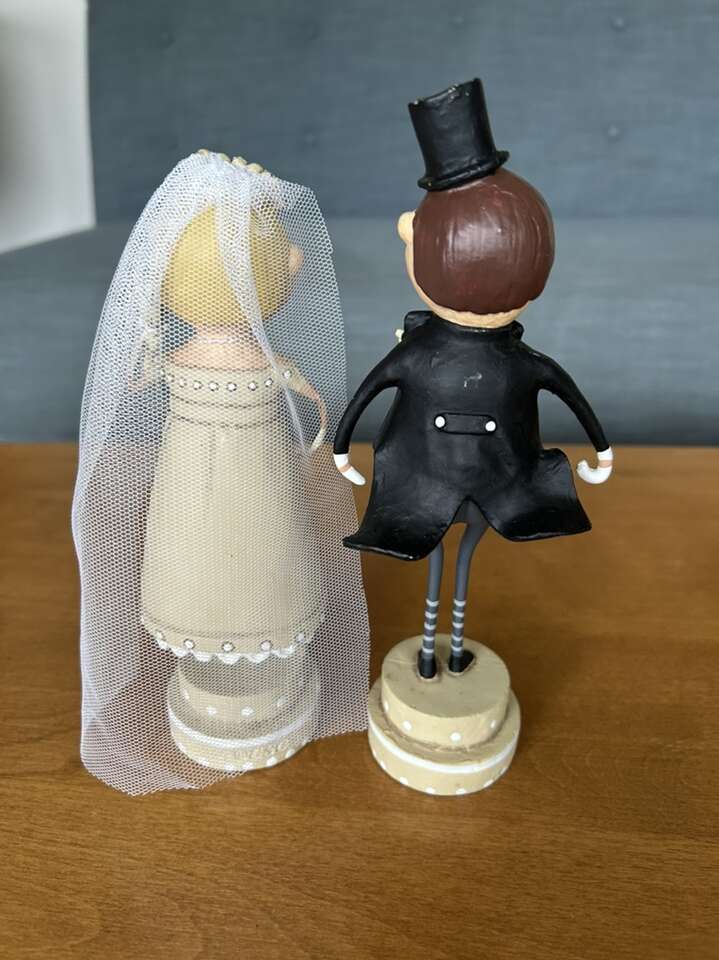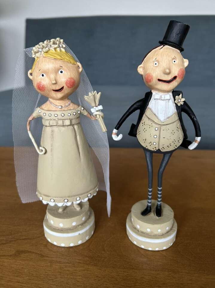 Authentic Lori Mitchell Bride and Groom Collectible Figures (Wedding Belle and Lucky Fella). Darling collectible wedding figures, hand-painted resin and wire. Bride with beautiful dress, necklace, veil, and bouquet. Groom in tuxedo, top hat, and boutonnière (missing cane). Could be used as cake toppers. Very good condition. Text only. Cash or Venmo.