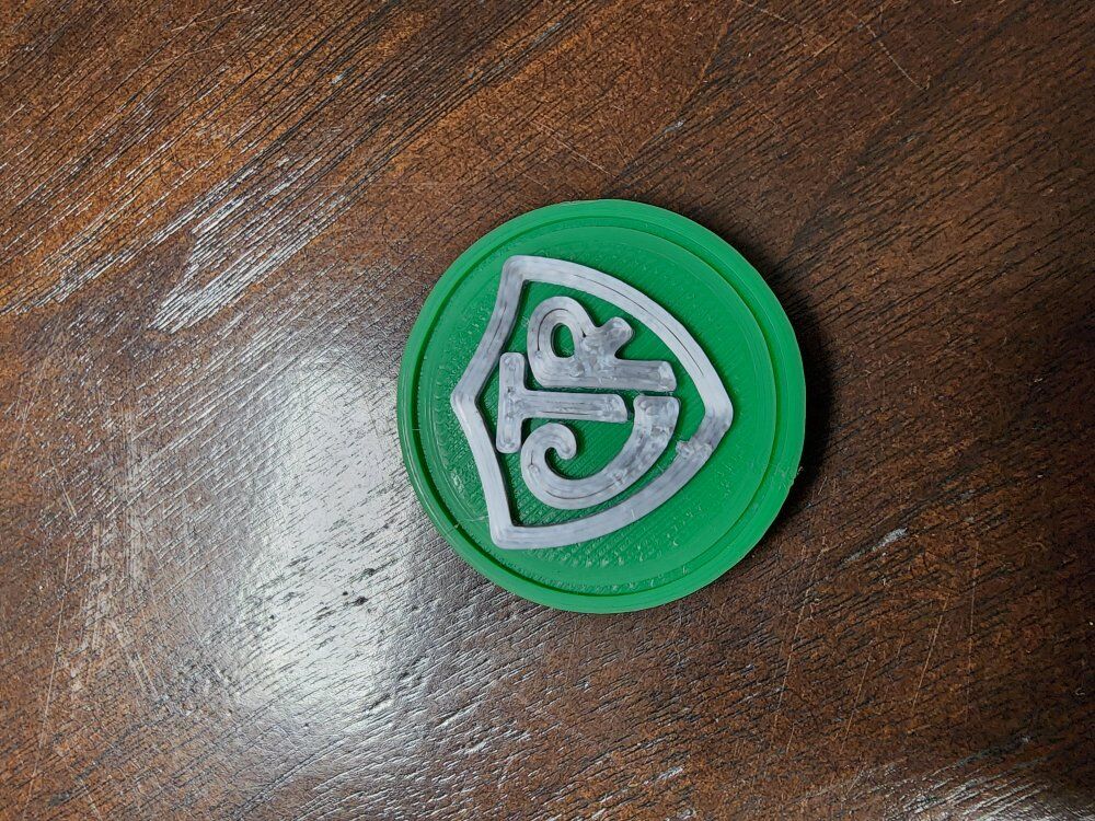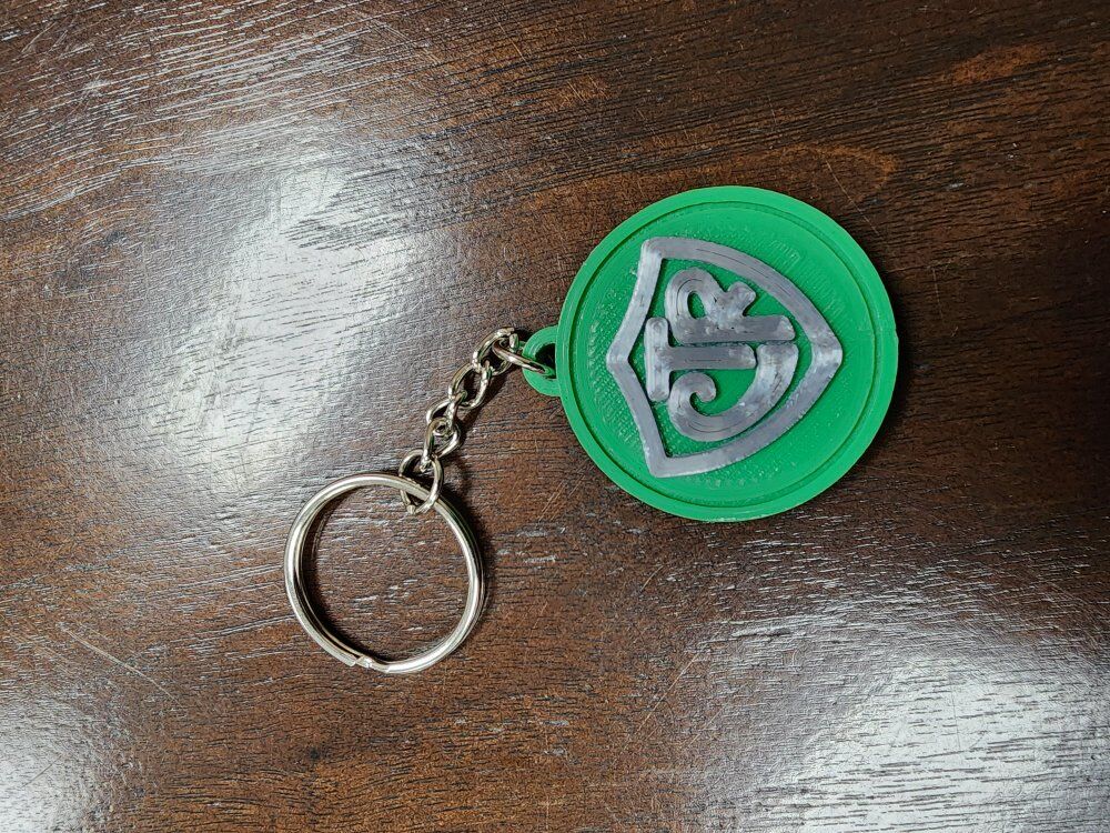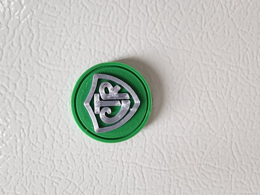 Made from gold silk PLA with a neodymium magnet. Also available as a keychain.