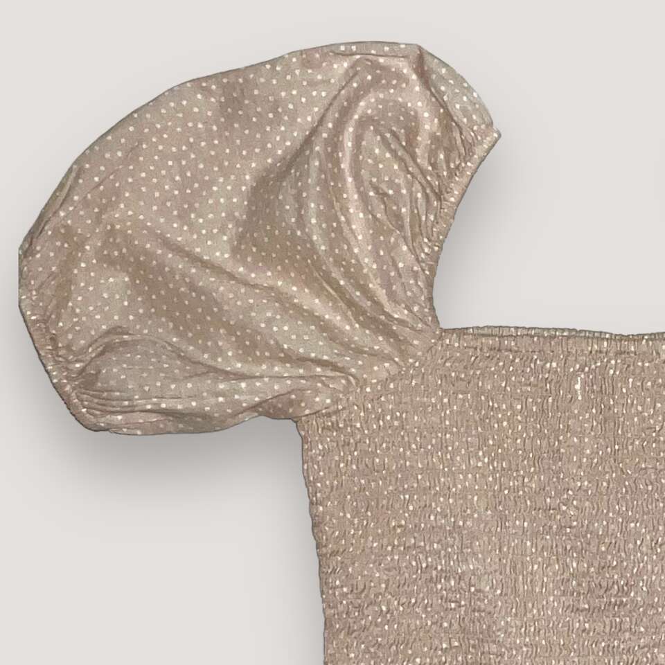 ApplePayPrice reduced to $20. Only worn once. Beautiful champagne tan colored polka dot smocked top with puff sleeves. Has an elastic stretch bodice that is form-fitted. Sleeves can be worn up or down for an off-the-shoulder look. The perfect chic neutral with jeans, dressed up or down. 69% Polyester 31% Elastane