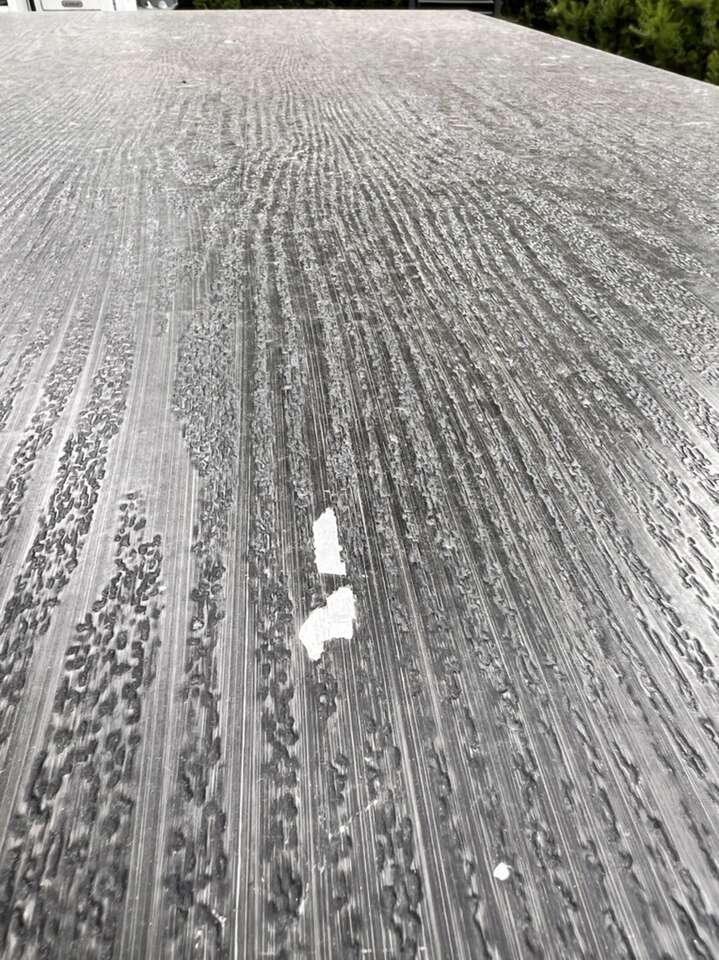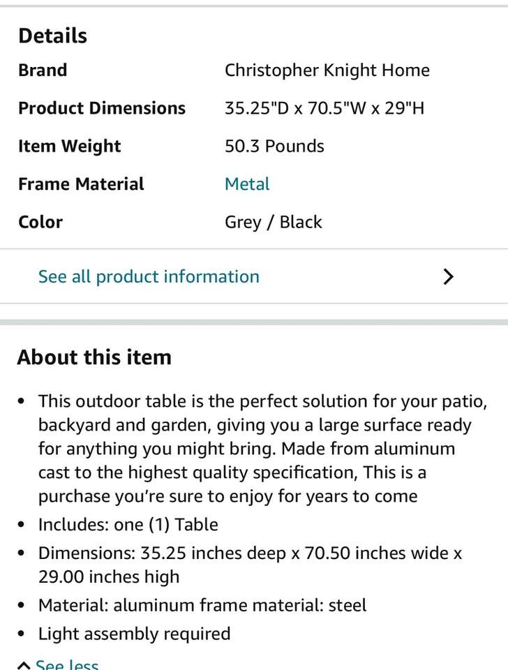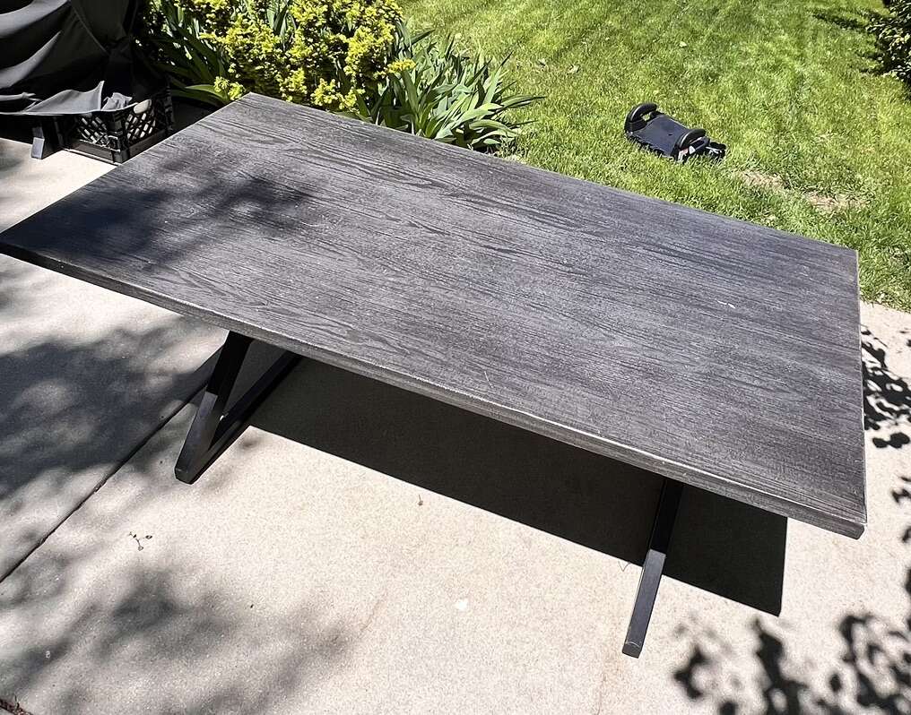 Aluminum rectangular table 70”x 35” and matching bench. Dark grey wood grain look. Very sturdy, well loved no rust, has a couple nicks and chips on top as shown in pictures hence the low pricing on this.