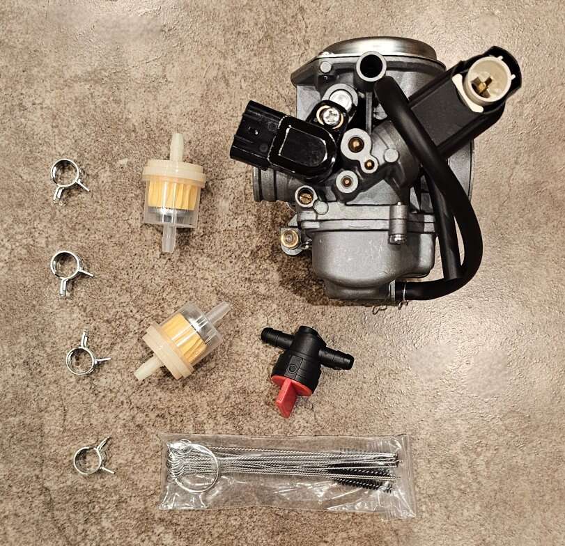 Package includes: (Photos show actual items plus stock pictures) 1x Carburetor 2x Fuel Filters 4x Hose Clamps 1x Cleaning Kit 1x Fuel Petcock