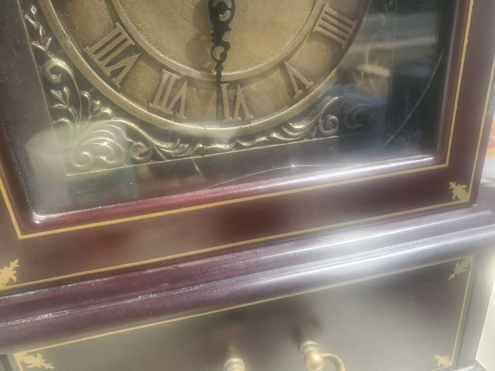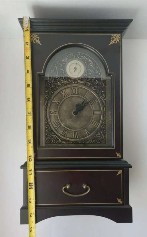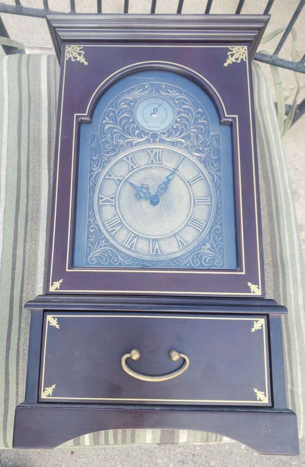 Beautiful wooden mantle clock with thermometer, felt lined drawer and the front simply opens up to reveal a secret storage compartment for storing key's, jewelry, precious items, defense items, etc.