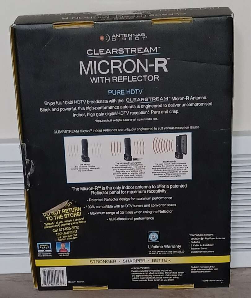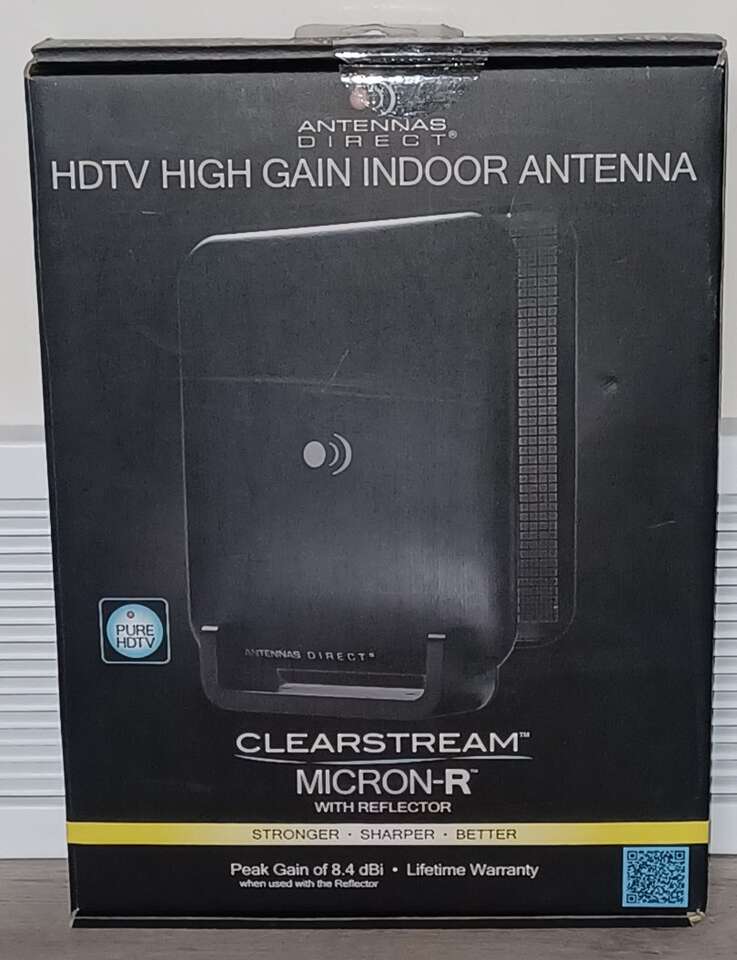 Clearstream Micron-R with Reflector HDTV High Gain Indoor Antenna Made by Antennas Direct Peak gain of 8.4 dBi NEW IN BOX Box says it has a lifetime warranty. Multi-directional performance. Amazon has this Antenna for $72.77 plus tax. Tech Support phone number inside and outside of box. FCFS Cash only.