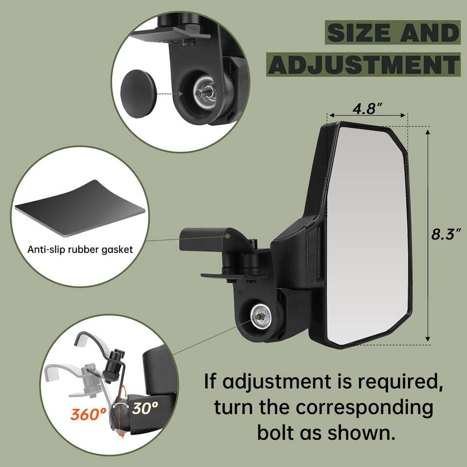 Please note Not applicable to cylindrical anti-roll bar, not applicable to models with full door,Does not fit ranger with canvas crew doors,A very small number of models have a different angle of tilt for the roll cage, and you may need to bend the bracket a little to see the back better Good QualityAdopting genuine impact resistant ABS material mirror shell, sturdy and durable, the mirror surface is anti-explosion and anti-dazzle high-definition convex glass,It's a nice product upgrade