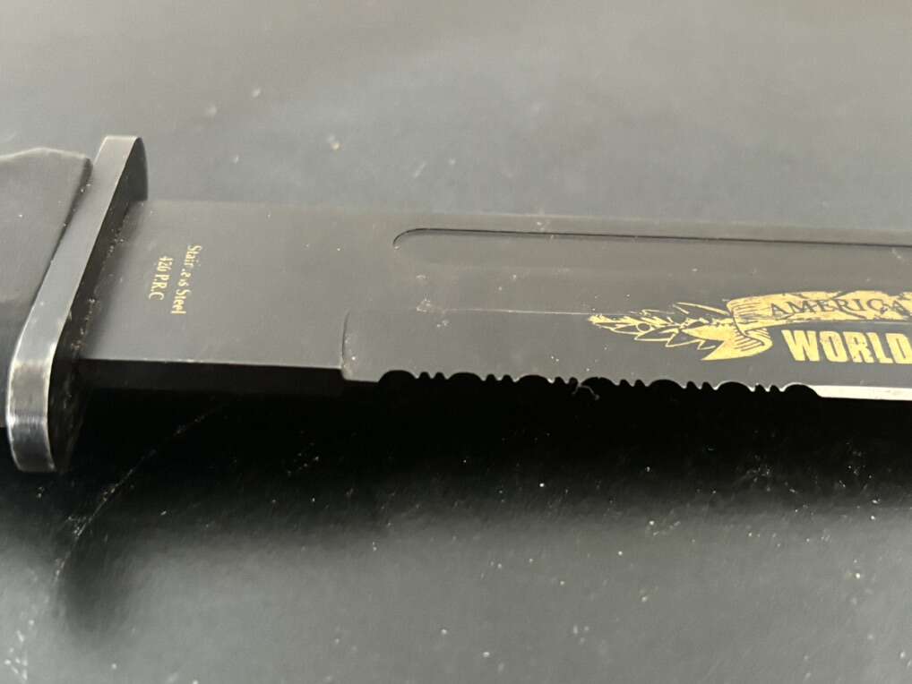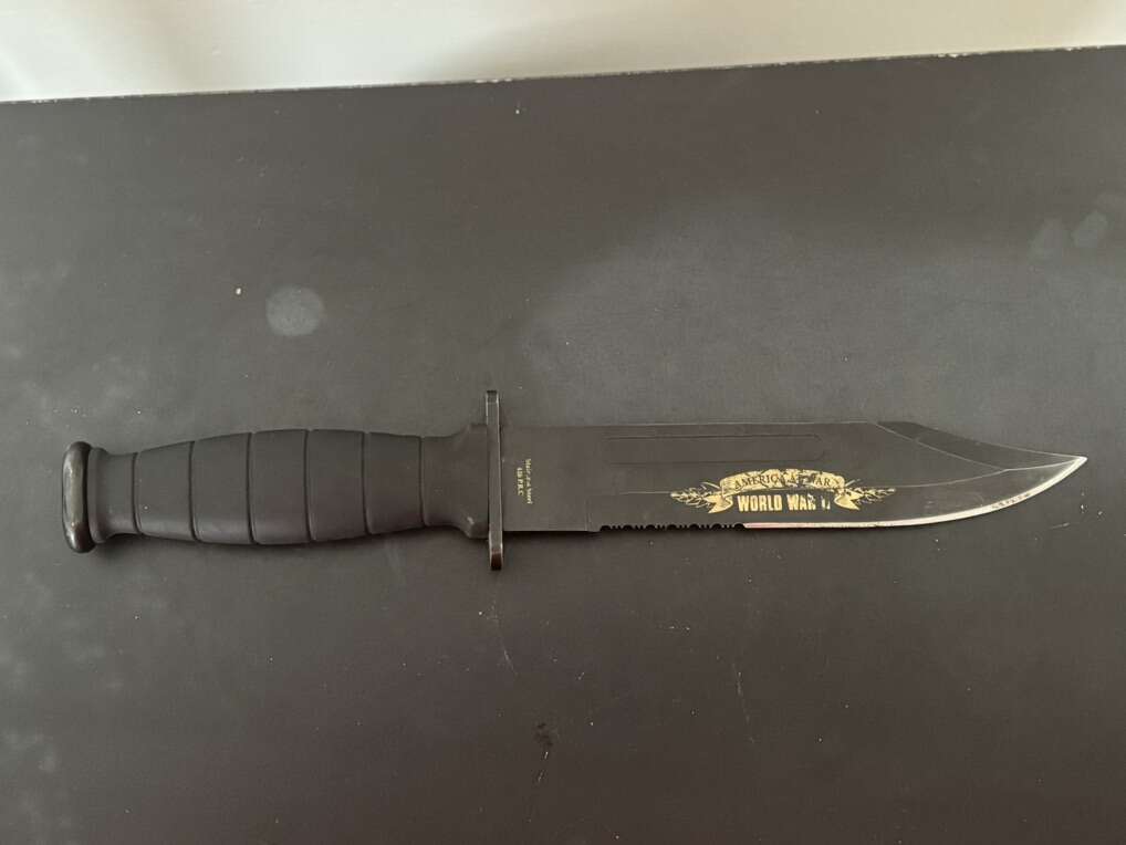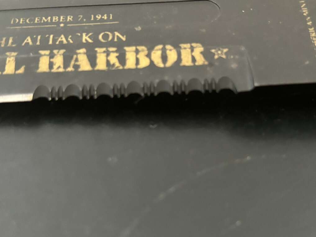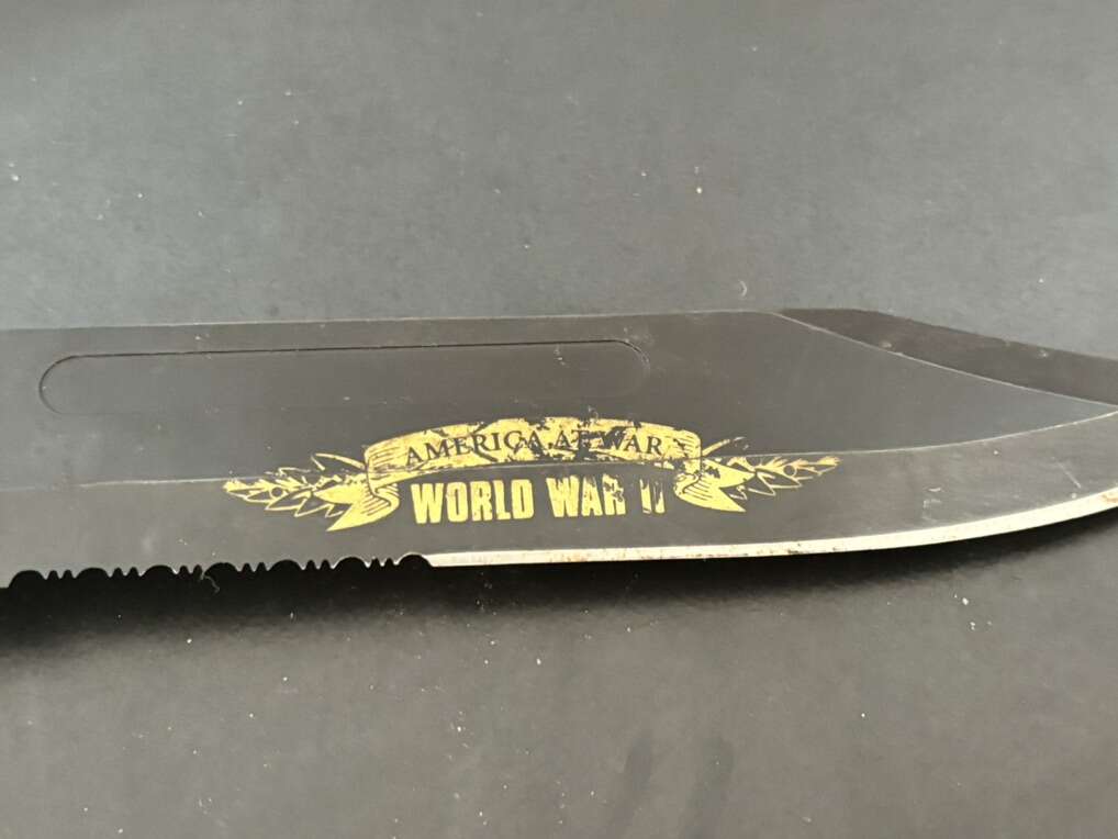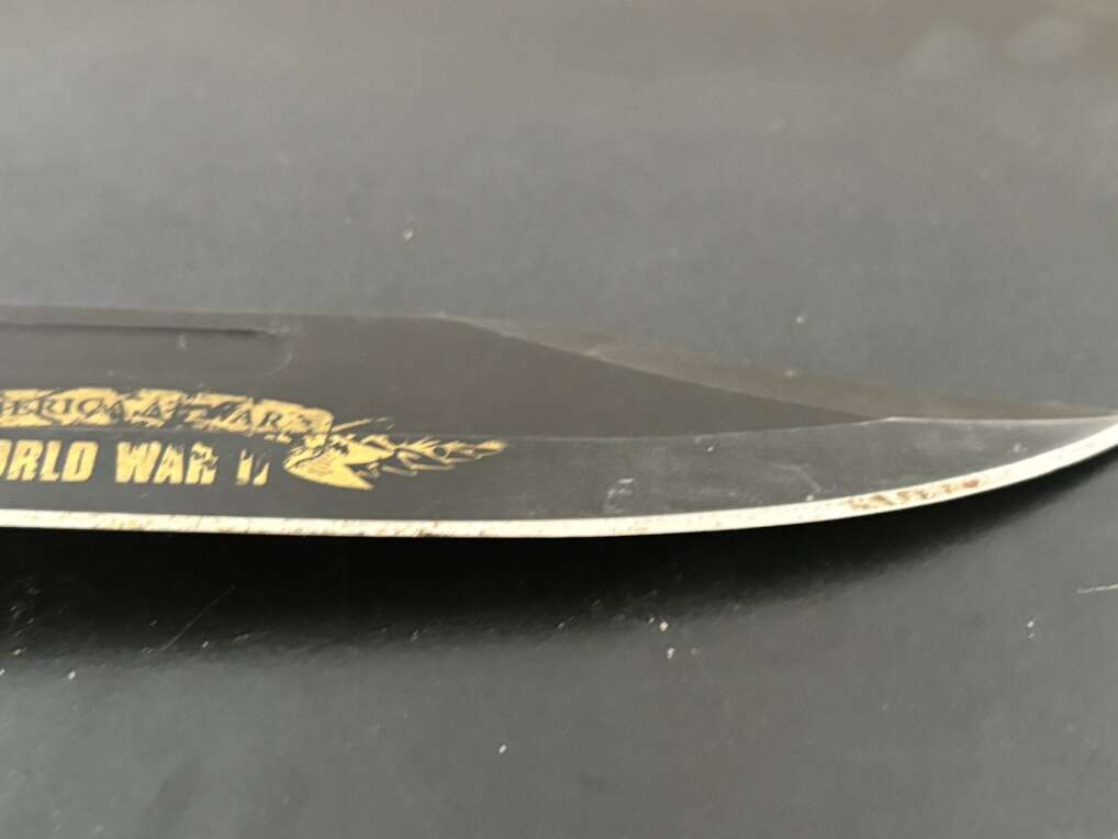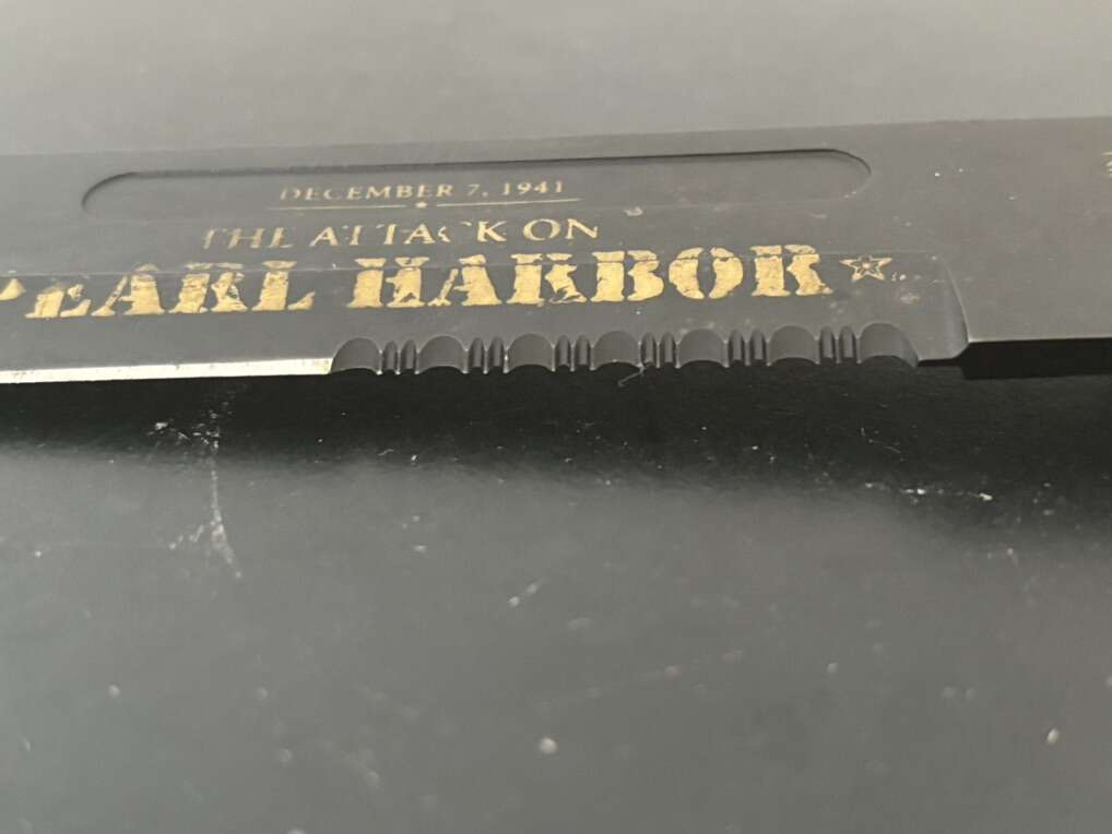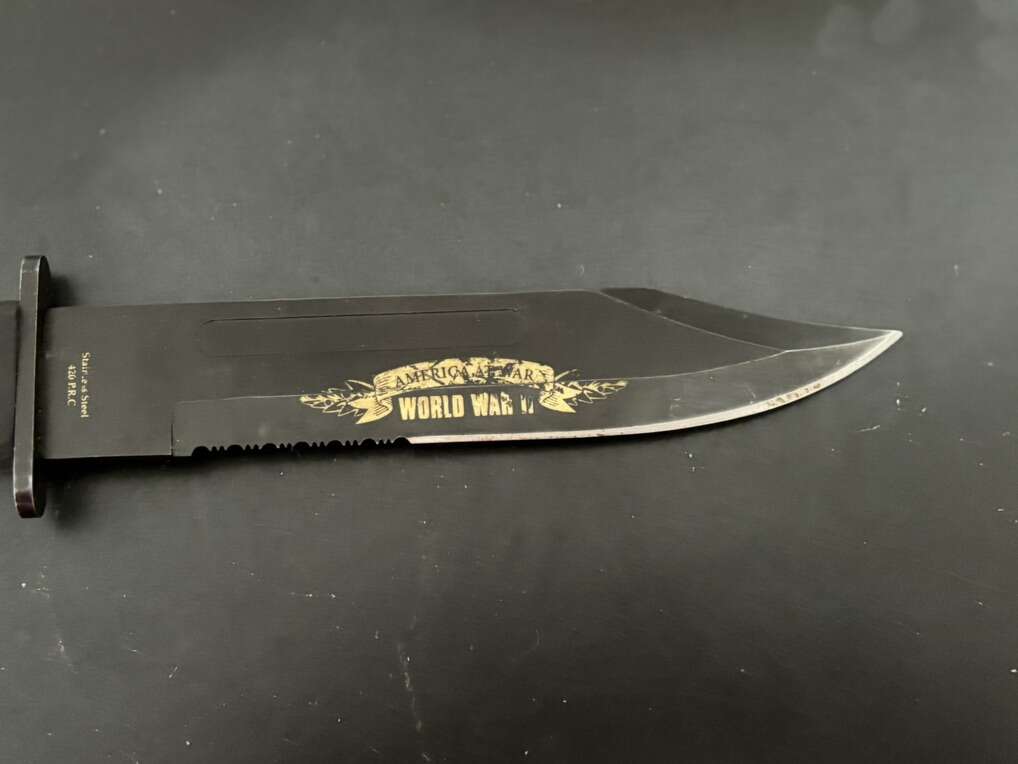 Attack on Pearl Harbor Military Bowie Knife Crafted in 420 stainless steel to resemble combat knives carried by U.S. Marines during WWII. 7 1/8 blade with matte black finish and rugged leather grips