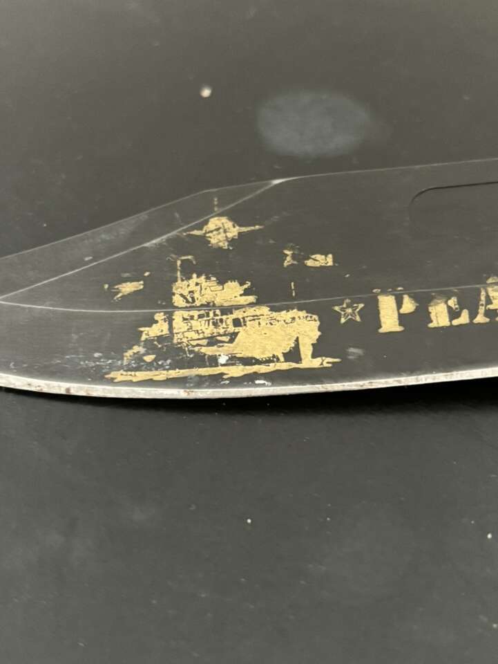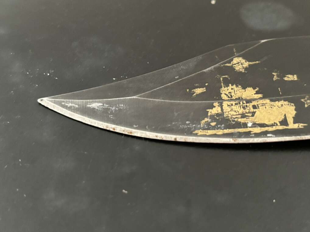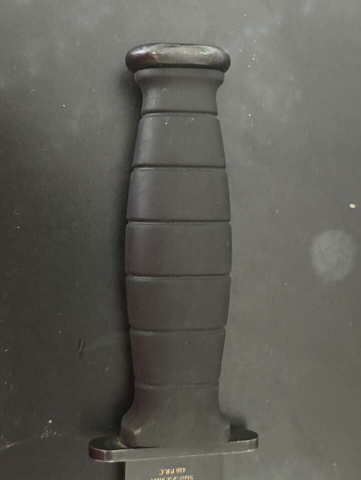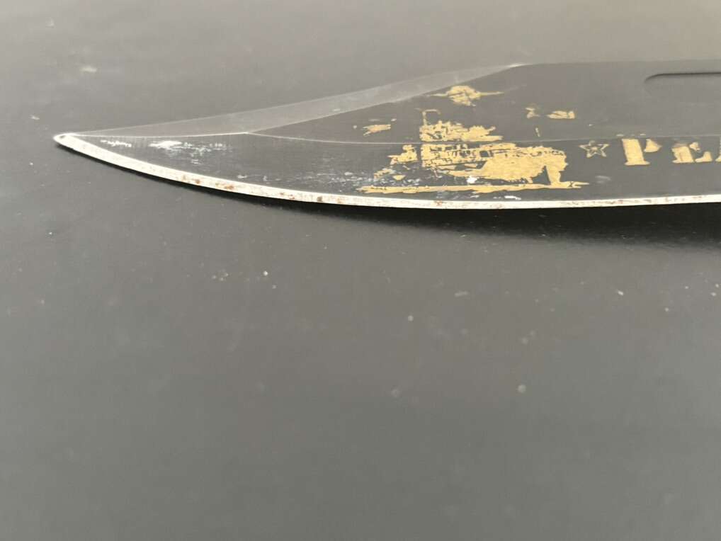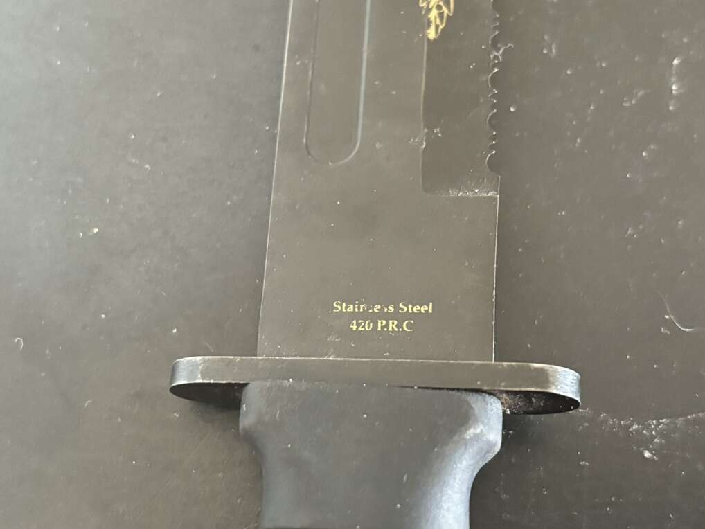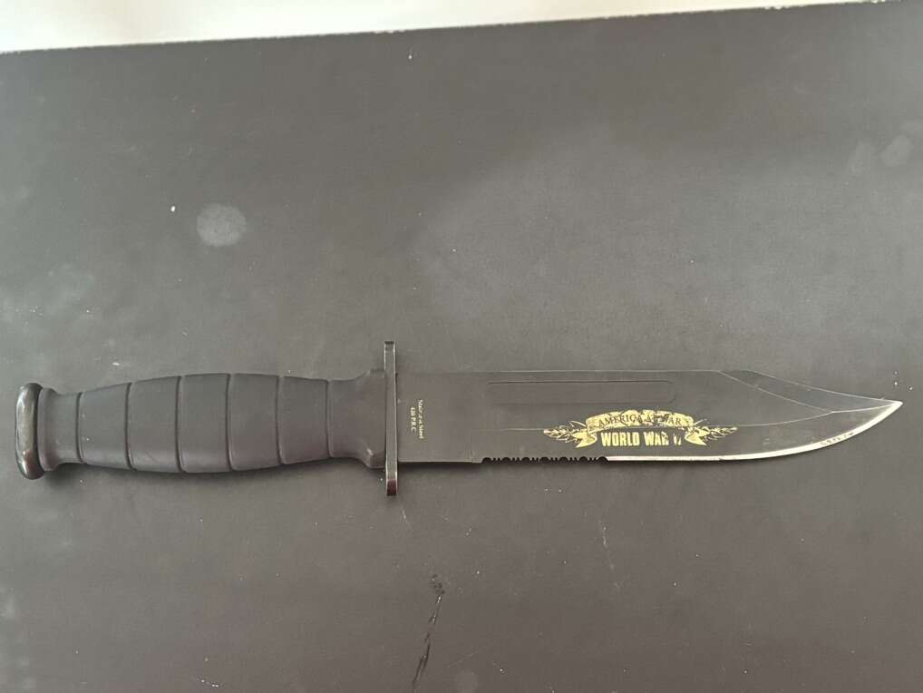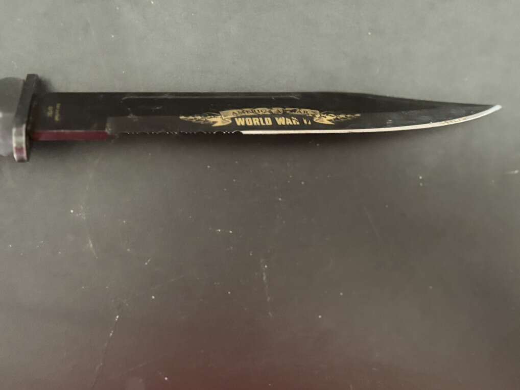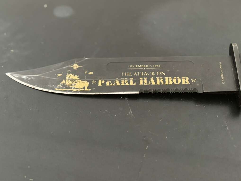 Attack on Pearl Harbor Military Bowie Knife Crafted in 420 stainless steel to resemble combat knives carried by U.S. Marines during WWII. 7 1/8 blade with matte black finish and rugged leather grips