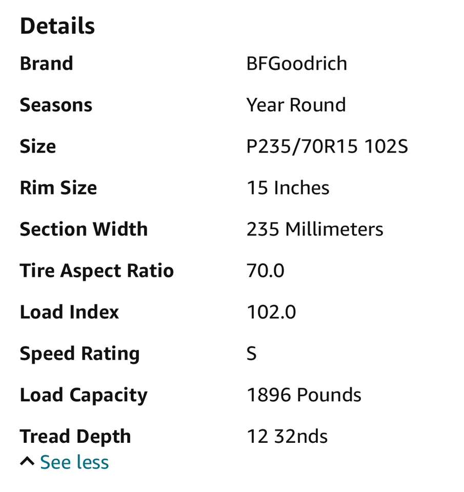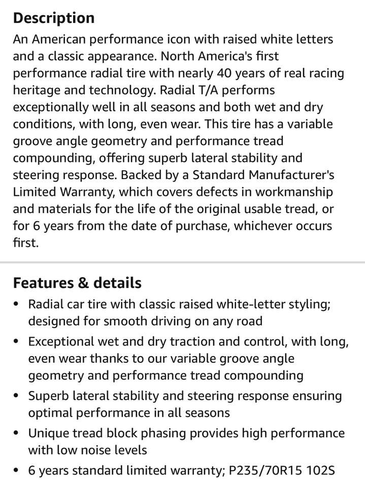 Description- P235/70R15 102S all-season radial T/A passenger car tire. See photos for more product information and specifications.
