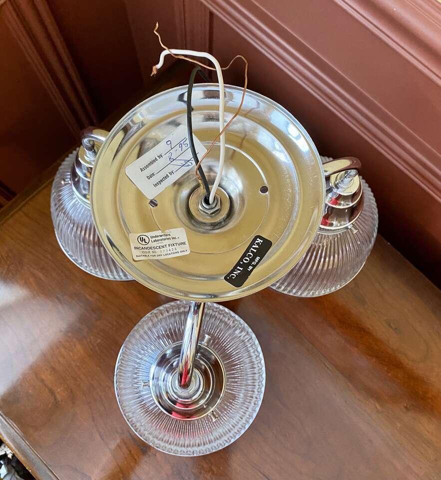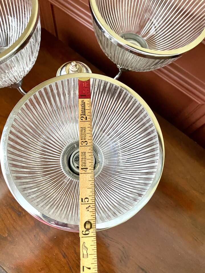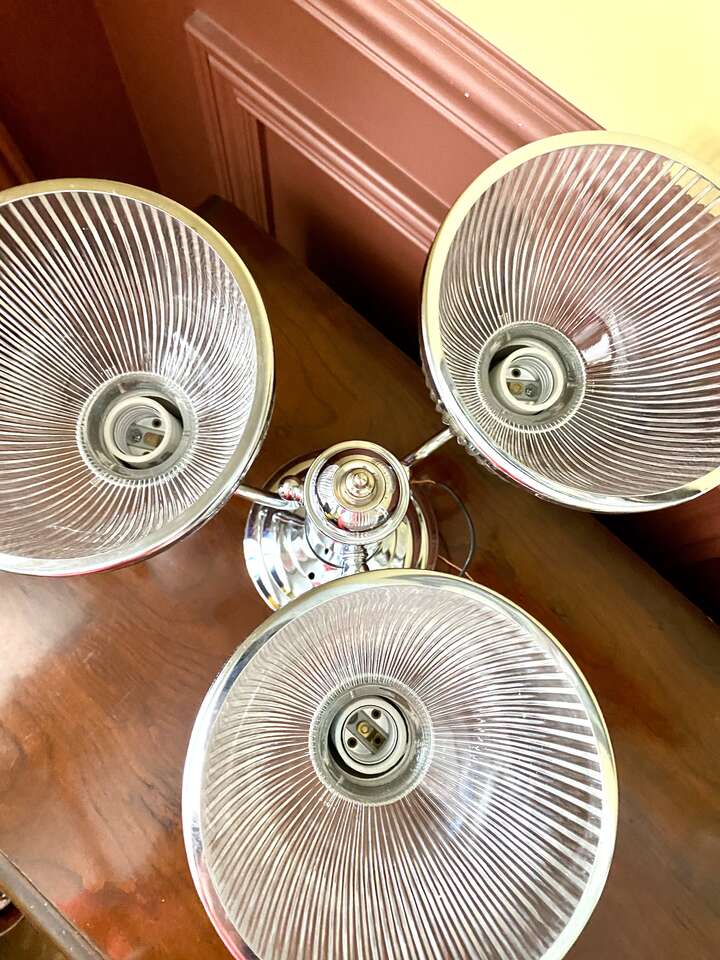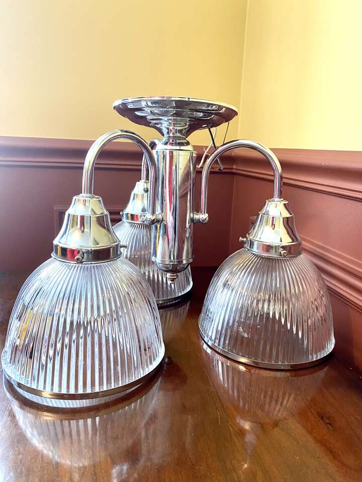 Beautiful Vintage Stainless Steel 3 Cup Hanging Light Fixture - Ribbed Glass - See All Photos.