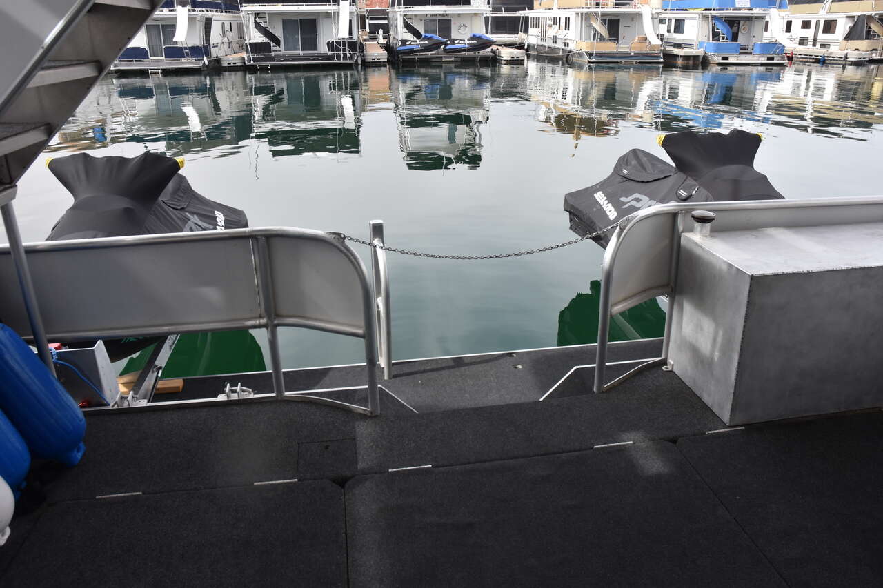 Weber barbecue grill, Blackstone Grill and Treager Smoker, 2 outdoor dining tables, solar battery bank, interior heaters for the cooler months, gas stove/oven, washer/dryer, full frig, standalone freezer, portable icemakers, microwave, dishwasher, solar and two 4-cylinder 3.0 Liter Monsoon motors and 15 KW Westerbeke generator. Tankless Water Heater (Unlimited Hot Water) · Rudder indicators (Upper and Main Helms) Front Side Thruster · Portable Ice Makers · Fresh Water Tank (100 Gallon) · 120 volt High Volume water pumps · Brand New Emacerator Pump Toilets · New LVL Flooring on Main Level · (2)Toy Tanks w/Pump (200 Gallons Each) · Premium Location Slip at Wahweap Marina - Lake Powell – Transferable The Boat is located on F Dock which allows the Mules to drive your stuff all the way to your boat. It is located close enough to the restaurants for convenience, but far enough away if it is busy. · 60" TV with surround sound in Living Room · 60" TV with Swing Mount and surround sound on Upper Deck, Custom Cover · (6) Premium Exterior Speakers and Receiver/Amplifier on Upper Deck · Upper Deck and Front Deck ceiling fans · Third Level Sun Deck · 15 kW Westerbeke Generator · 3 1/2 Ton Water Source Heat Pump (Air conditioner/Heater) · Front Deck Freezer · Weber Gas Grill · TV Satellite Antenna · (4) Bedrooms - 2 King, 2 Queen · (2) Bathrooms · Washer & Dryer - Stacked · Outback Invertor System w/(6)NEW High Capacity AGM Batteries · Solar Panel System Partnership just replaced the 4 cylinder engines and Alpha One Outdrives with new V-8 engines and new Bravo outdrives. Upgraded Solar System has recently been completed.