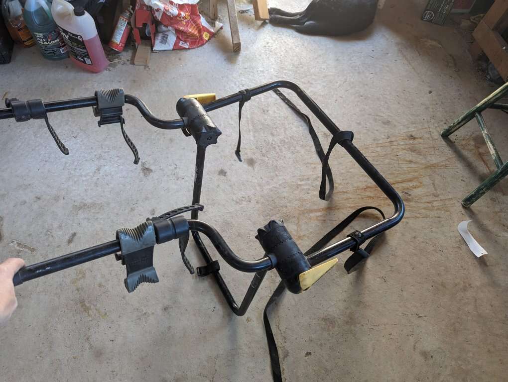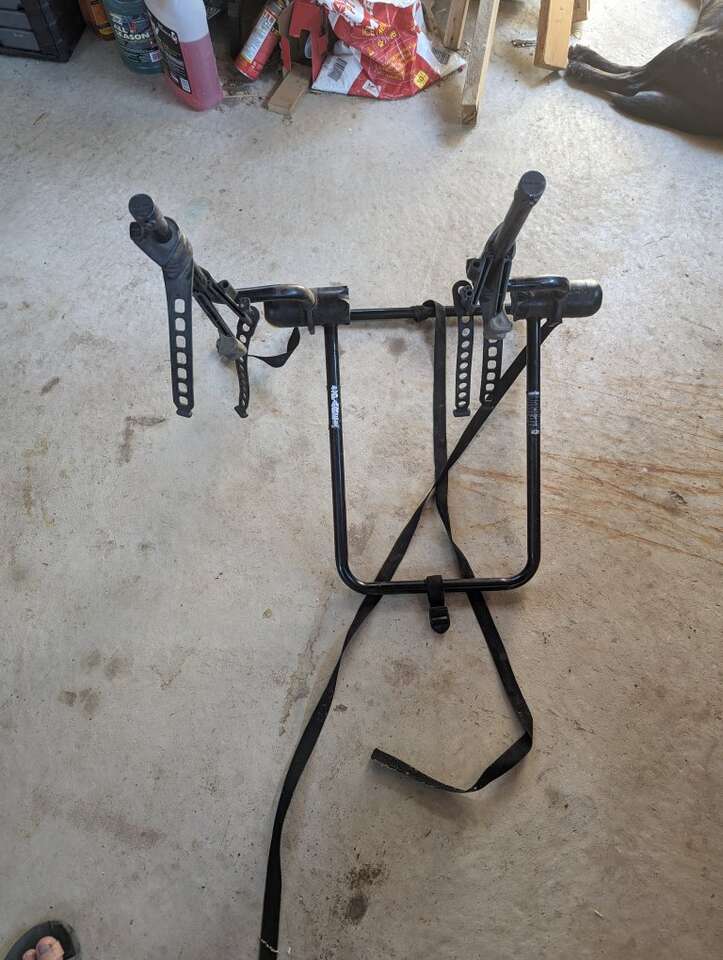 Rhode gear brand Holds two bikes. No longer have my jeep. I replaced the rubber straps so it's in great shape. Always stored indoors. Folds flat when not in use