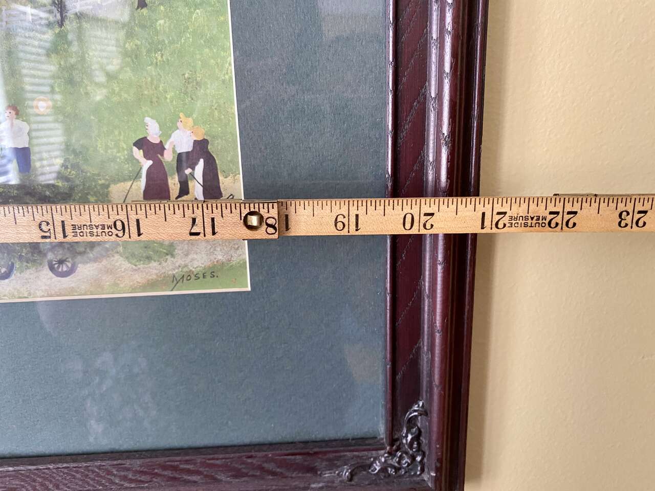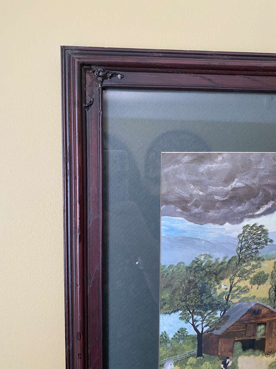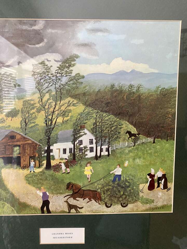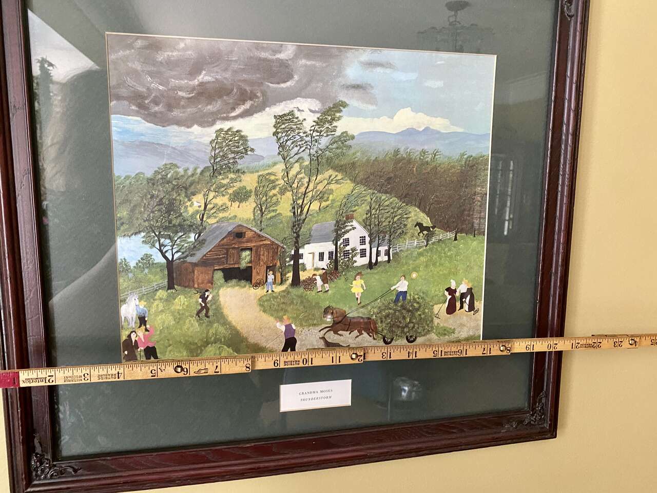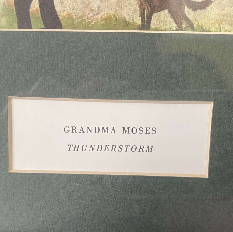 VINTAGE GRANDMA MOSES Framed Print Called THUNDERSTORM - Folk Art Artist - See Photos. This is one of Seven I am selling by Grandma Moses. On this one the top left of the wood frame is missing a small part of the ornate application. It could be used as is, or remove the other ornate corner applications and touch it up or paint the frame. I have adjusted the price due the this small frame issue due to age. Sorry about the reflection.