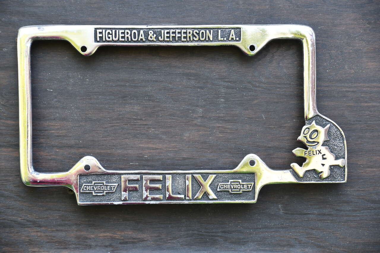 Vintage Style FELIX CHEVROLET FRONT AND BACK LICENSE PLATE FRAMES - Heavy Metal. These are the ones with Cats on the side. Cash only in Plain City