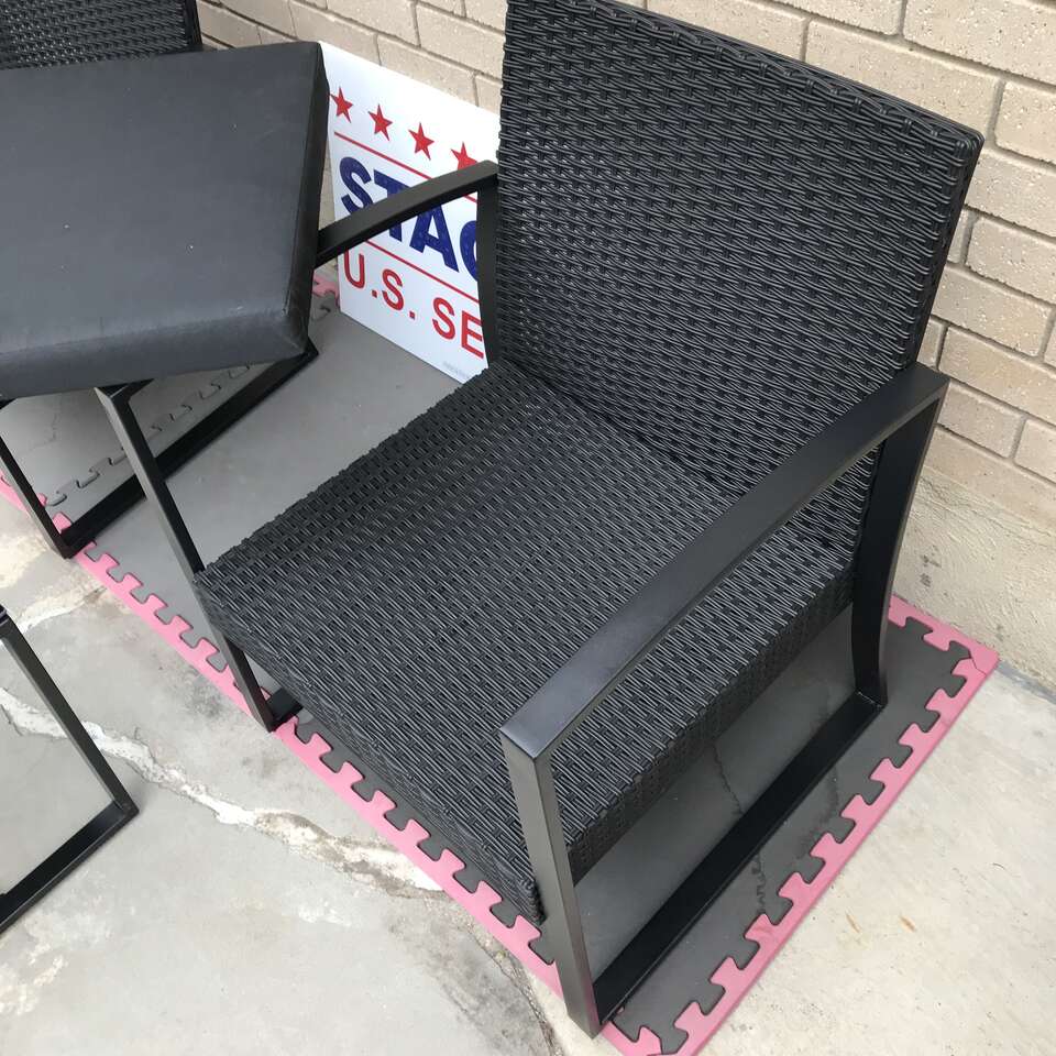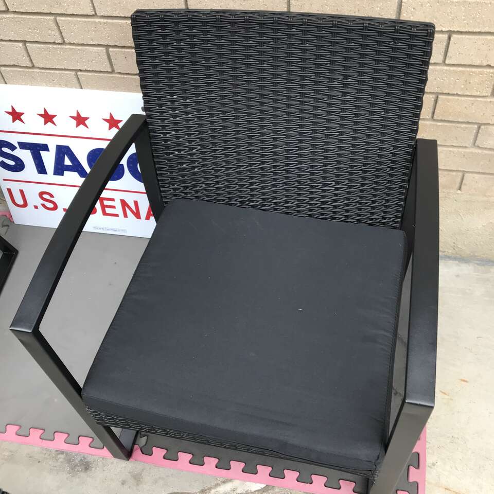 Two black chairs with paded seats outdoor quality pads