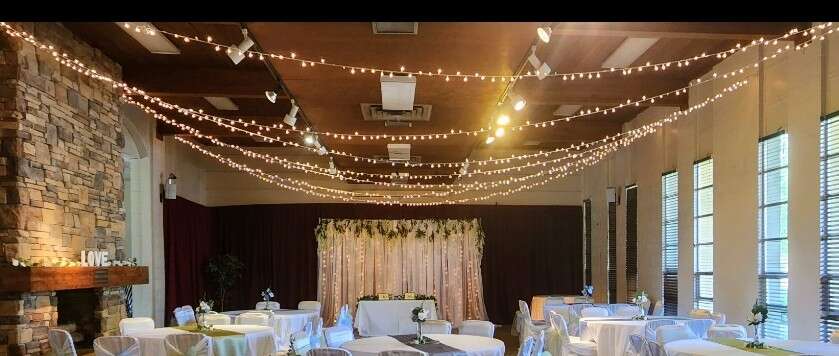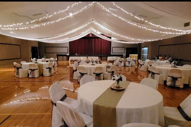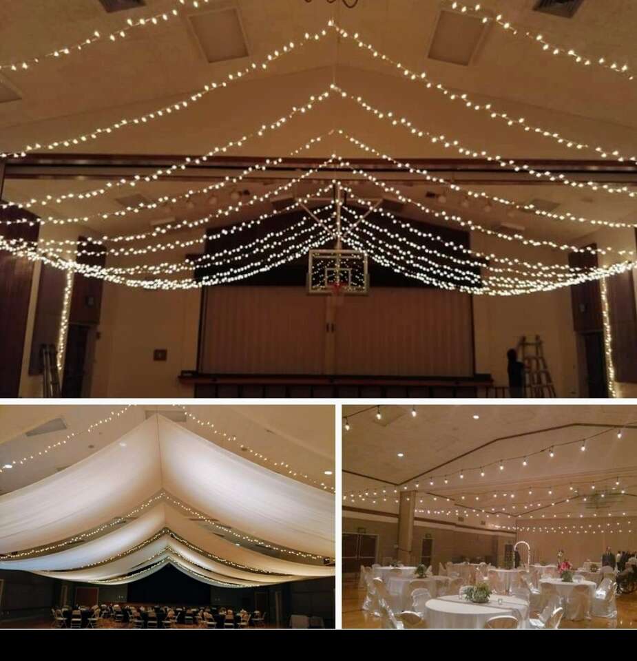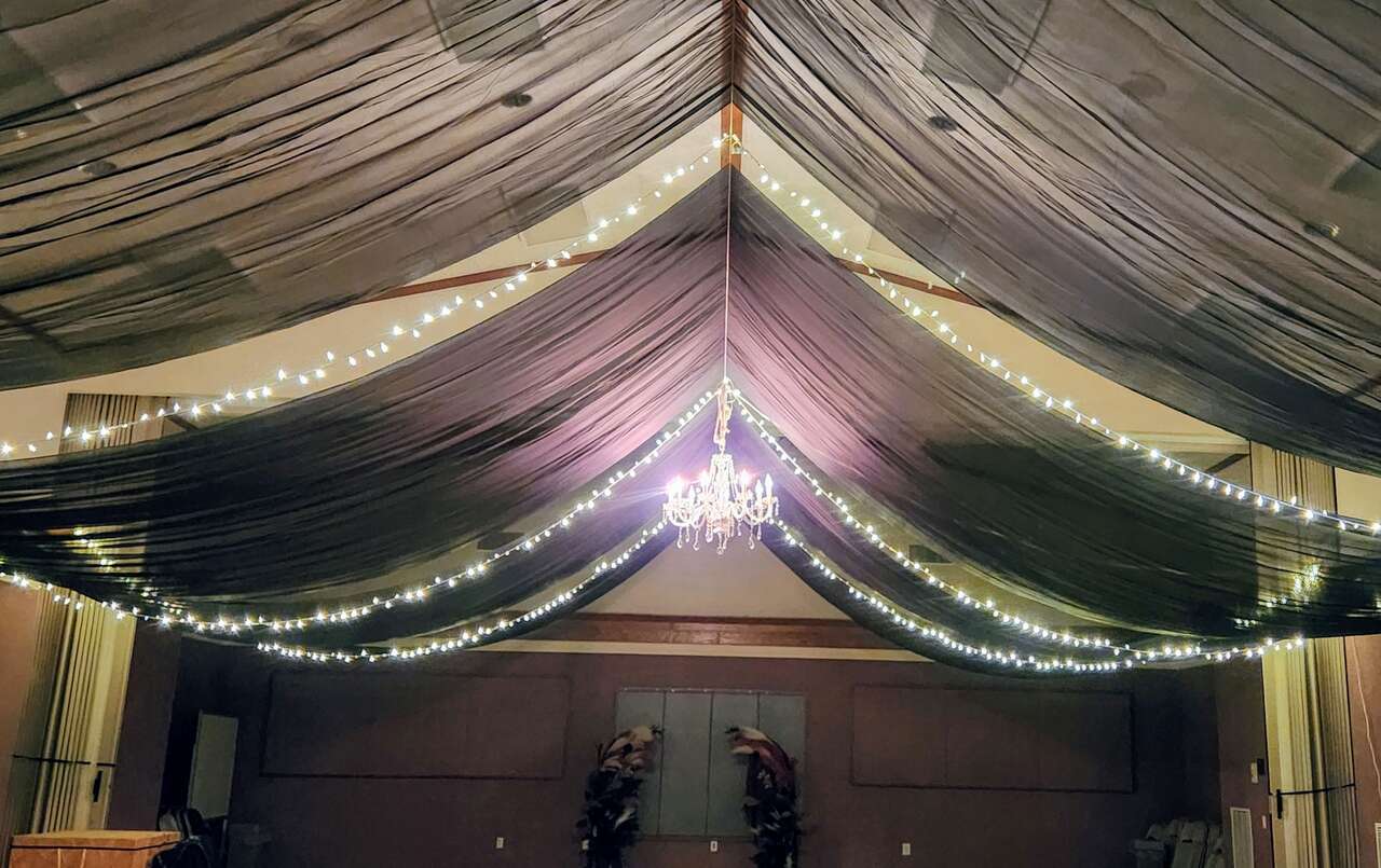 ZelleBeautiful fabric ceiling drape and lighting available for your wedding or special event. Prices start at $250 for lighting and $550 for fabric and lights. New black fabric just added to our inventory Change average into AWESOME! We deliver and put up.