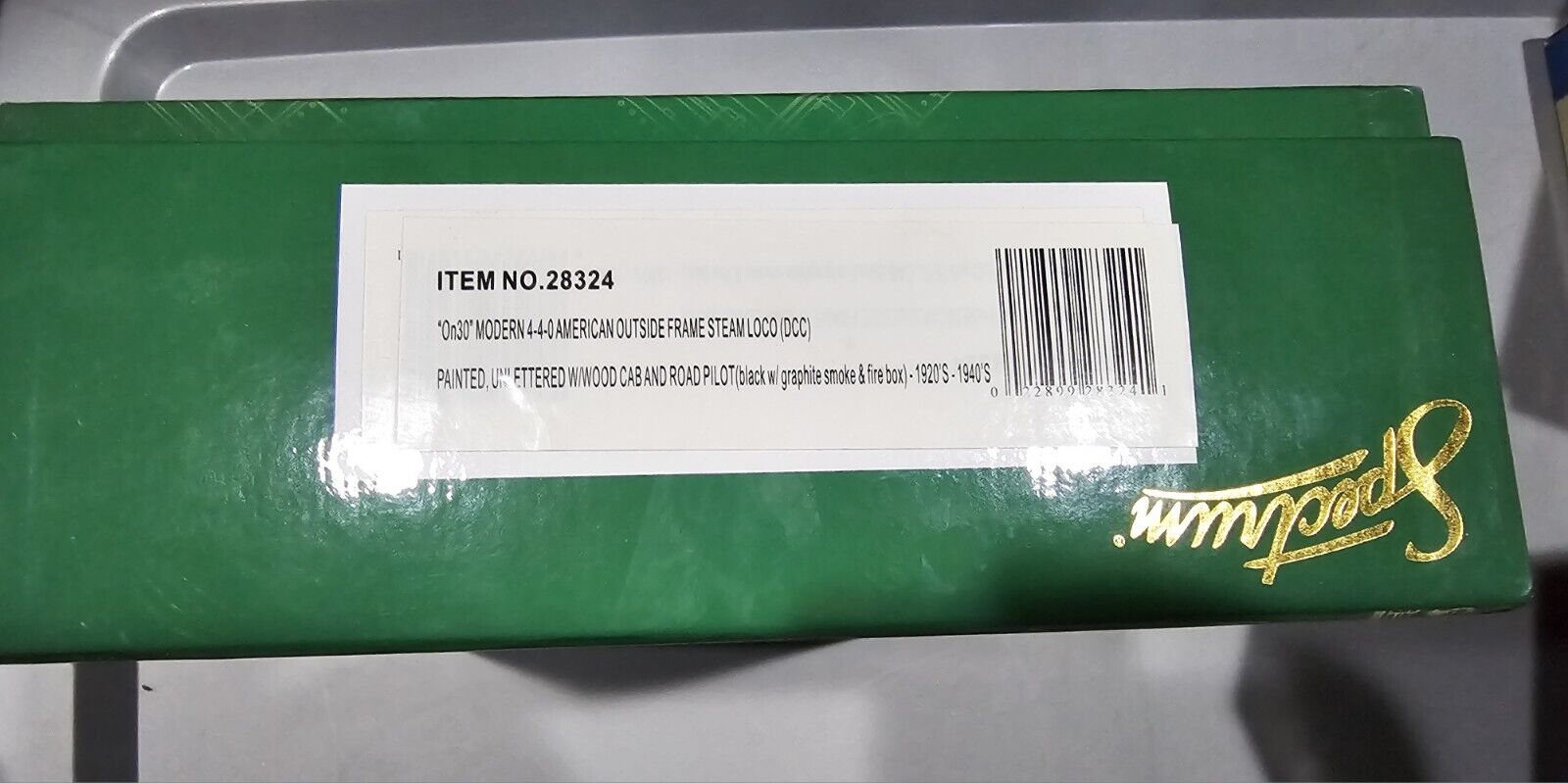 Bachmann Spectrum 28324 On30 Scale Painted & Unlettered 4-4-0 American Wood Cab Steam Locomotive & Tender with DCC. Not only was the 4-4-0 configuration the best-selling wheel arrangement of all steam locomotives, it was the longest running as well, first appearing in the late 1830s and seeing service until the end of the steam era. The 4-4-0 was a multipurpose locomotive that was stable, quick on rough track, and easy to maintain. As a result, more than 80,000 Americans were built for railroads of all gauges. Painted and striped as delivered, our model is based on Baldwin designs for 30-inch railroads, with multiple-style accessory features that allow modelers to customize their locomotive. Painted in color black and graphite and features operating knuckle couplers, realistic details, plastic trucks, and metal wheels and axles.